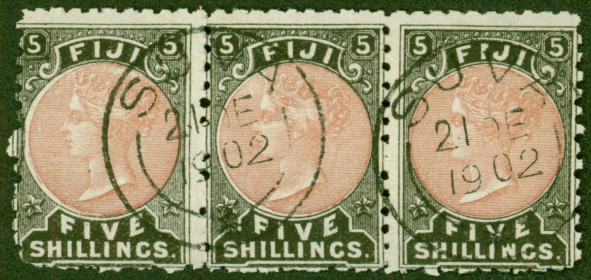 Fiji 1882 5s Dull Red & Black SG69 Fine Used Strip of 3