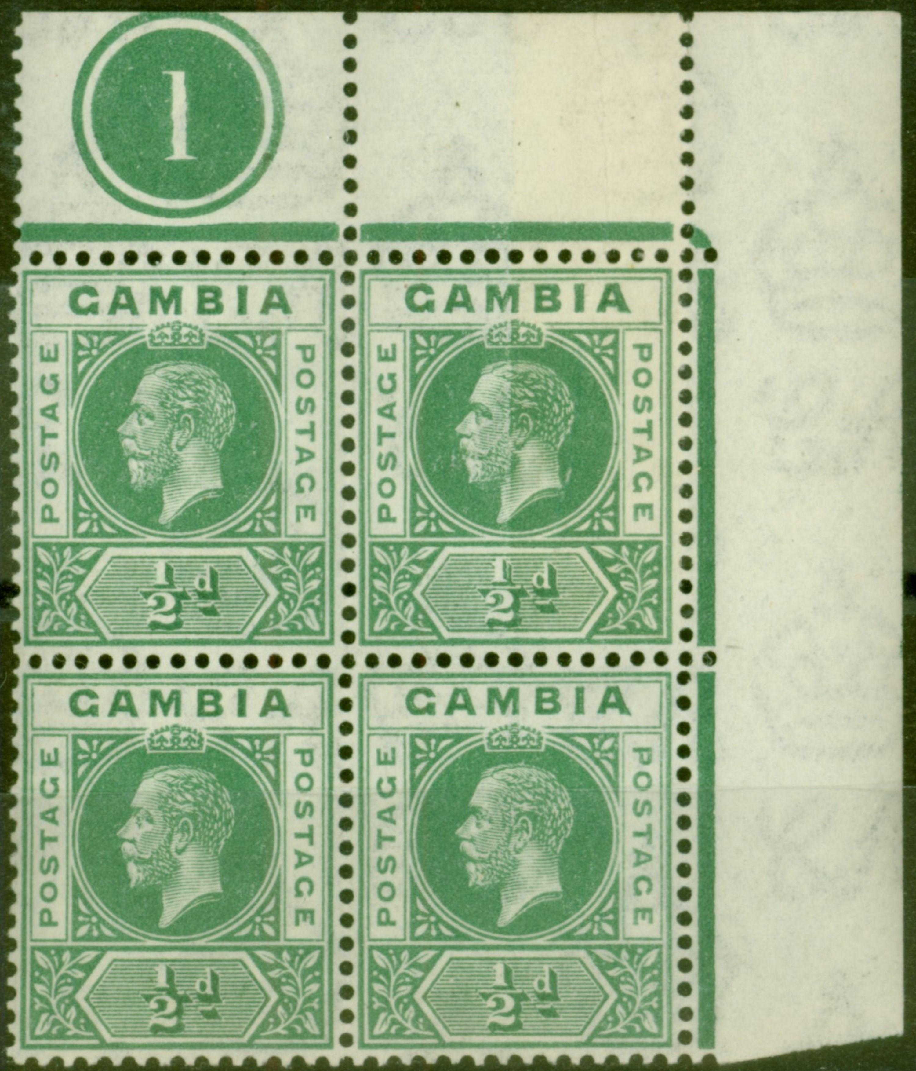 Gambia 1921 1/2d Dull Green SG108Var Pre-Printing Paper Join in a V.F MNH Pl 1 Block of 4