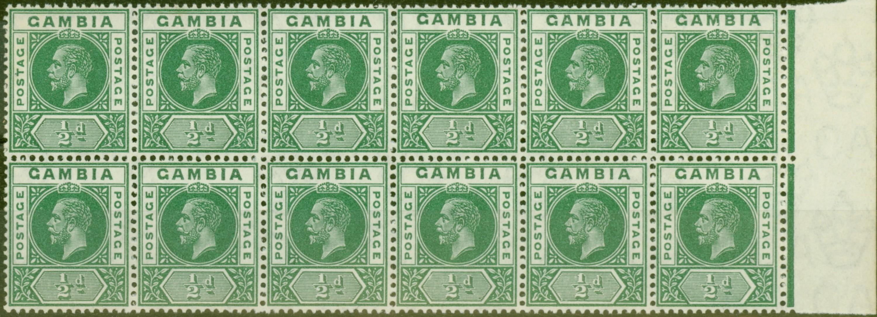 Gambia 1912 1/2d Green SG86avar Bisected M in Gambia in a Superb MNH Block of 12