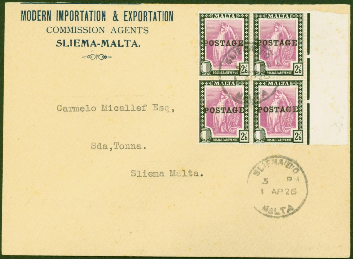 Malta 1926 Local 1st Day Cover Bearing Block of 4 2s6d SG154 V.F & Attractive