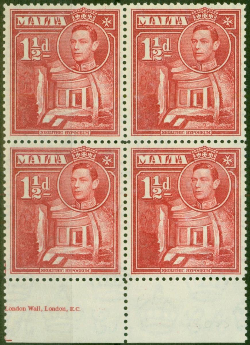 Malta 1938 1 1/2d Scarlet SG220a 'Broken Cross' in a Fine MNH Part Imprint Block of 4