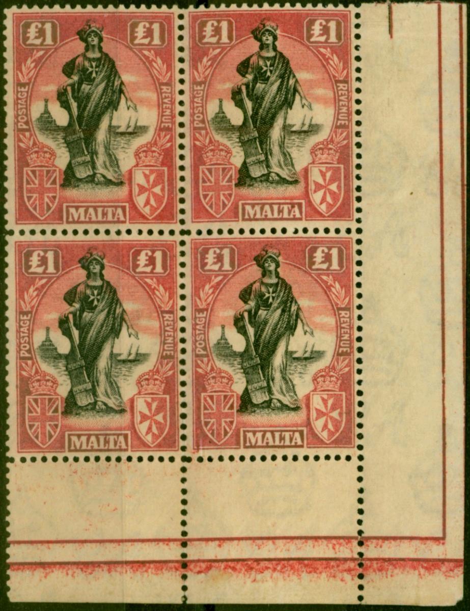 Malta 1925 £1 Black & Bright Carmine SG140 Fine MNH Corner Block of 4
