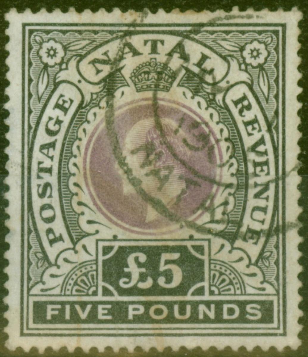 Natal 1902 £5 Mauve & Black SG144 Good Used Cleaned Fiscal Forged Cancel