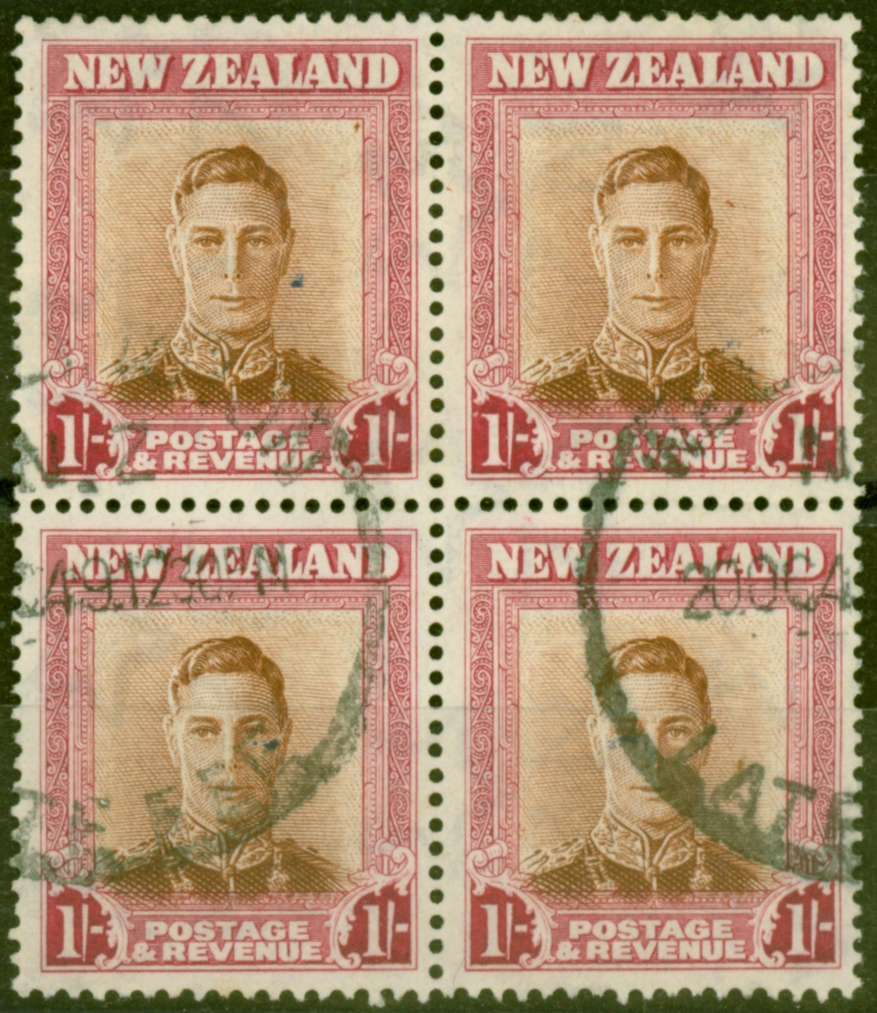 New Zealand 1947 1s Red-Brown SG686aw Wmk Sideways Inverted Fine Used Block of 4