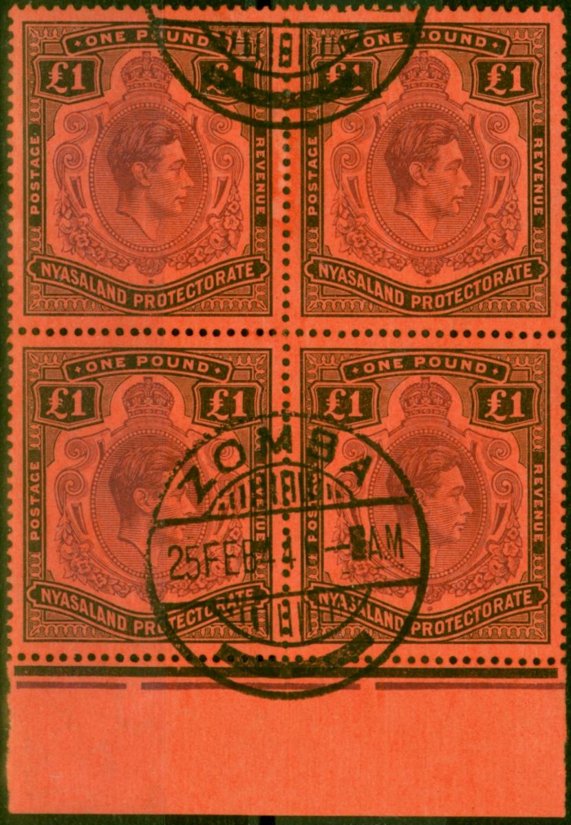 Nyasaland 1938 £1 Purple & BlackRed SG143 Superb Used Block of 4 'Zoma 25 Feb 44' CDS