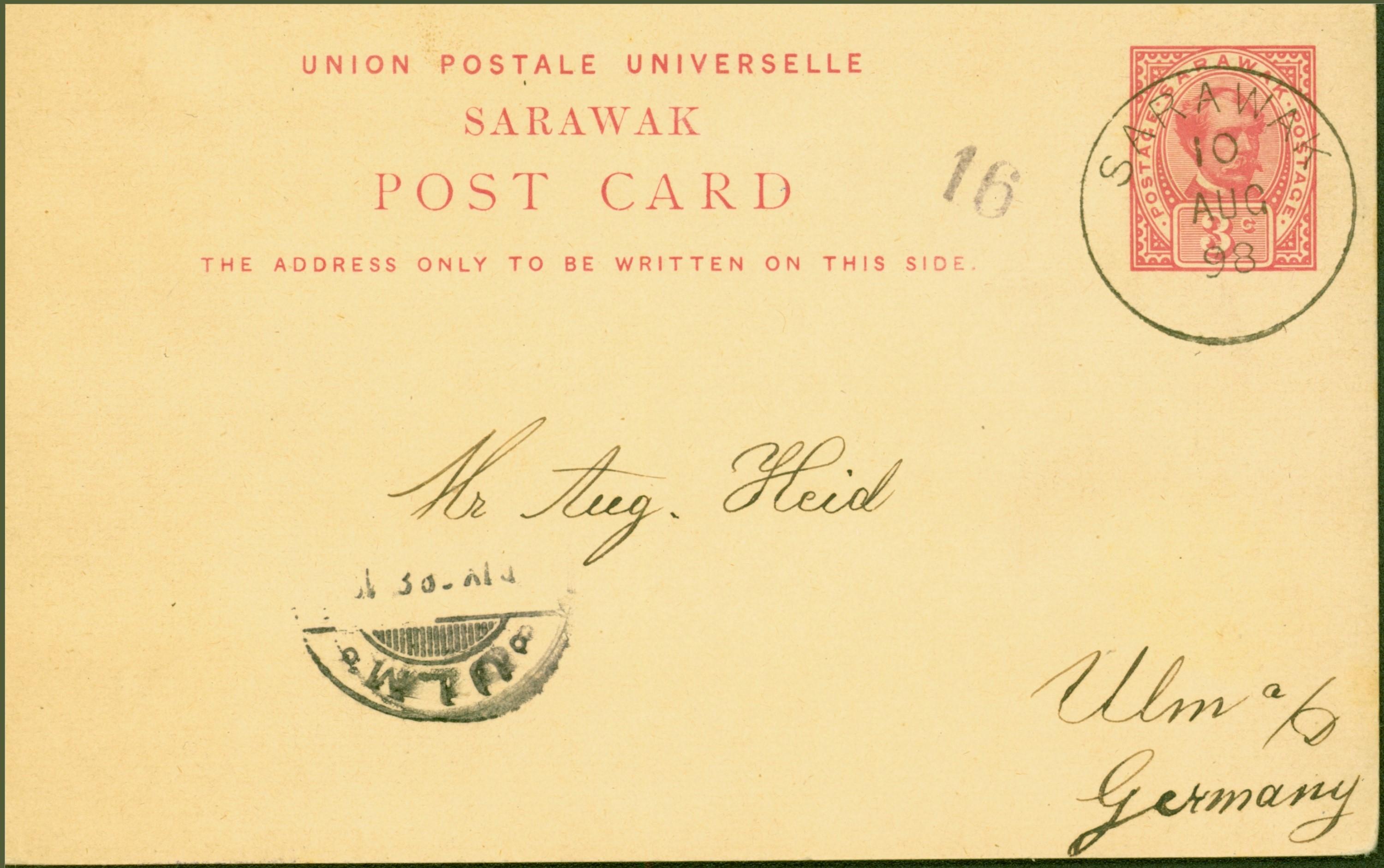 Sarawak 1898 3c Pre-Paid Postcard to Germany Fine & Attractive