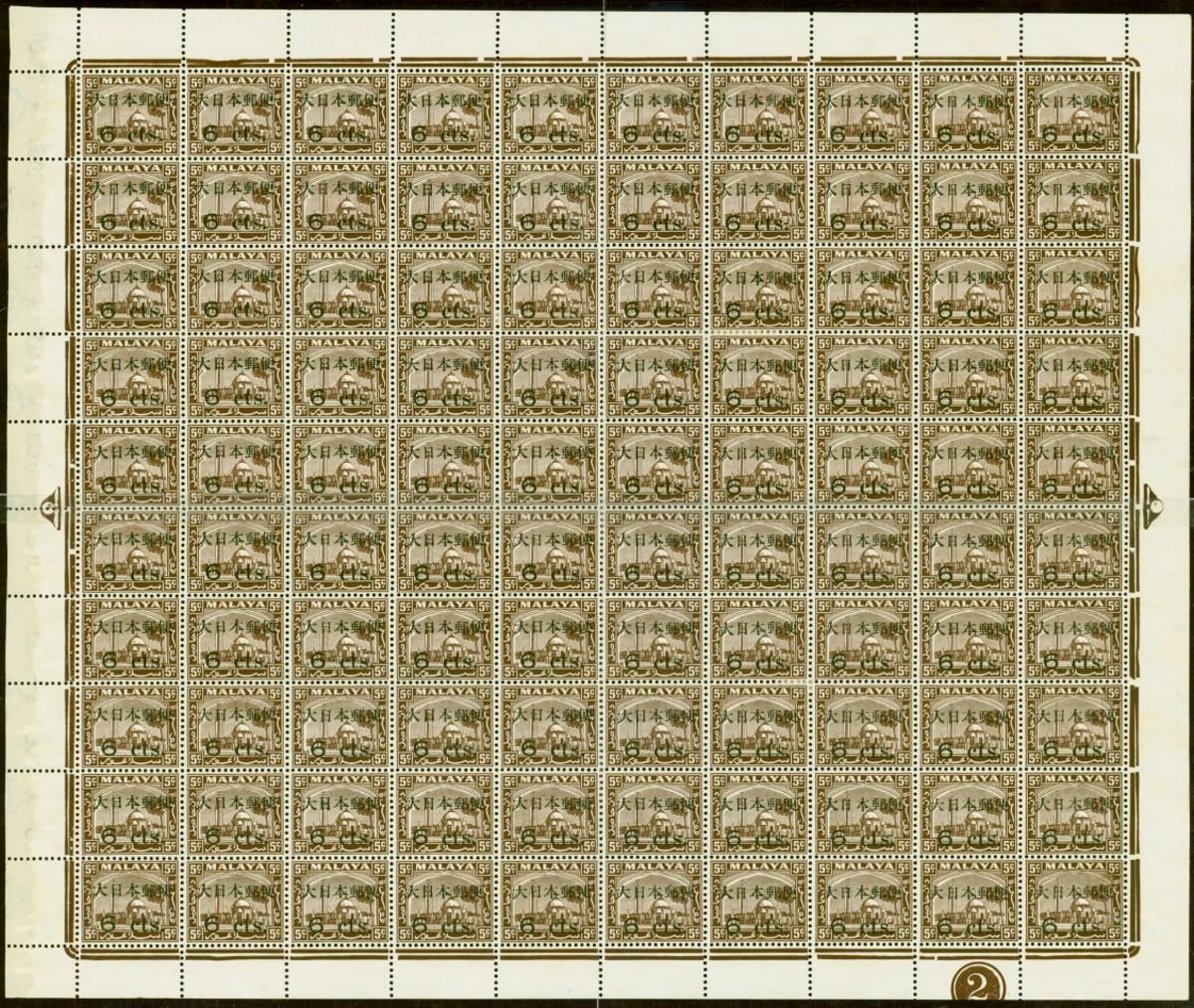 Selangor 1944 Jap Occu 6c on 5c Brown SGJ293 V.F MNH Complete Sheet of 100