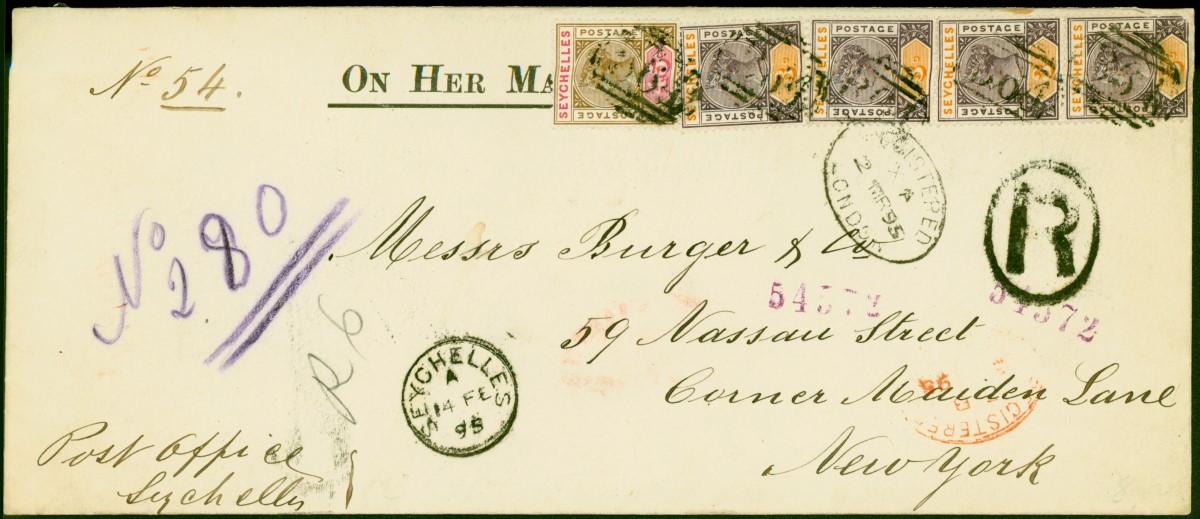 Seychelles 1895 O.H.M.S Reg Cover to New York Via London Bearing 3c SG22 x 4 & 45c SG25 V.F Attractive & Scarce