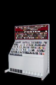 Einbauwarenträger Spacesaver 180: Ganz neu im Markt ist unser Einbauwarenträger Spacesaver 180 mit nur 47 cm Tiefe. Hier haben wir die Poster aufgestellt, um das Problem der mangelnden Tiefe bei Rückwandinstallationen zu lösen. Der Posterpräsenter integriert sich perfekt in vorhandene Regalinstallationen. Dieser Warenträger ist 125 cm breit, 47 cm tief und 195 cm hoch. Man kann damit bis zu 180 verschiedene Poster im Format 61 x 91,5 cm präsentieren. Alle unsere Warenträger gibt es in Wunschfarben, Standardfarbe hier ist RAL 7035 lichtgrau.