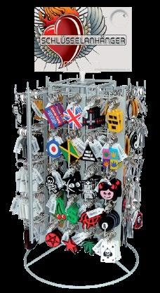 Unser neu erweitertes Schlüsselanhänger-Sortiment besteht aus 160 Motiven. Präsentiert werden die Schlüsselanhänger an Einfachhaken oder auf einem Thekenständer mit 80 Haken. Jedes Motiv kann einzeln nachbestellt werden. Verpackungseinheit: 1 Stück. Alle Warenträger stellen wir kostenlos und leihweise zur Verfügung.