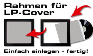 Kunststoff-Wechselrahmen mit Clipsystem und Acrylglas im LP-Format oder MDF-LPRahmen in edler Holzoptik mit 3 cm breiten Leisten und Acrylglas.