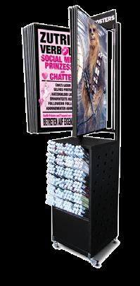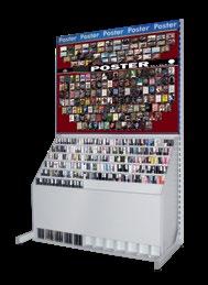 10 bis 20 Poster-Motive auf kleinstem Platz. Der Inhalt sind 100 gerollte Poster, das Display erstellen wir nach Kundenwünschen im Digitaldruck. Der Warenträger funktioniert auch mit Mini- oder Türpostern. Falls die Box mittig im Raum steht, kann man auf der Lochblech-Rückwand weitere Waren präsentieren.