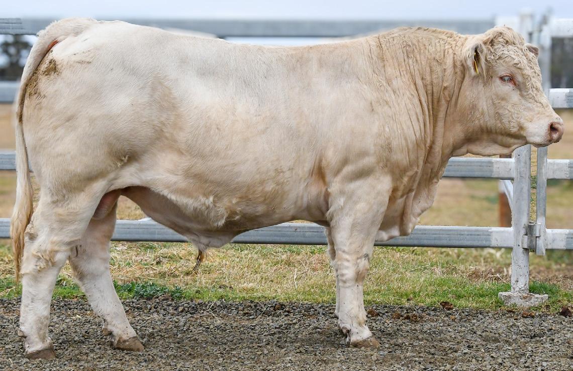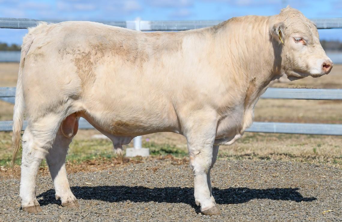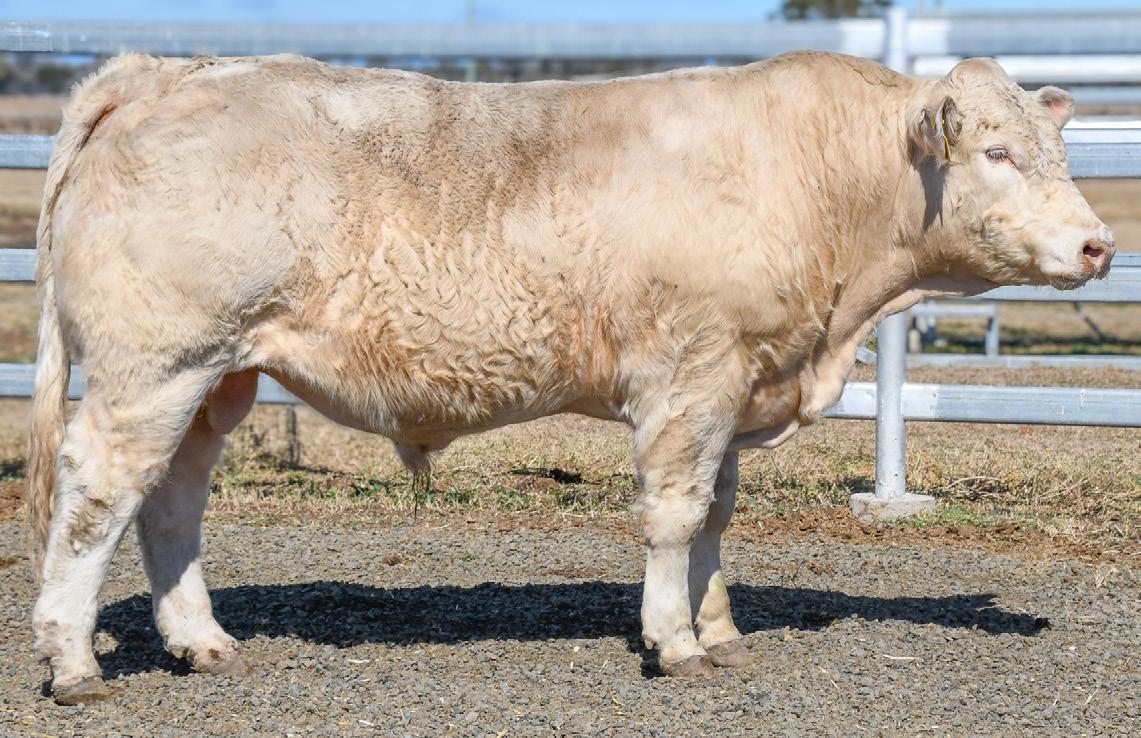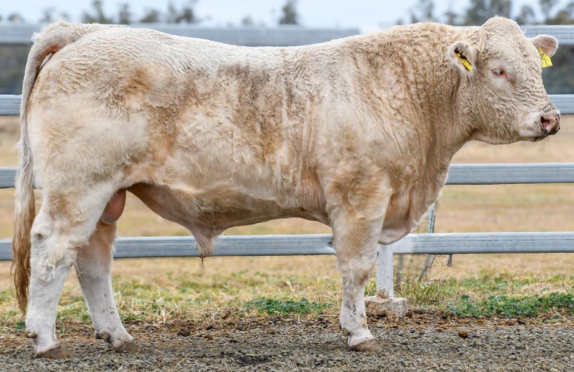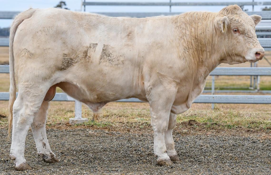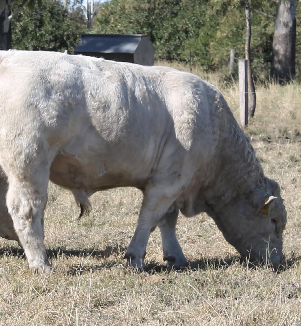 A well put together charbray bull that deserves a good look, 3/4 Charolais and 1/4 Brahman. A lovely sleek coat, tidy underneath and a nice muscle pattern. This bull also has a good temperament.