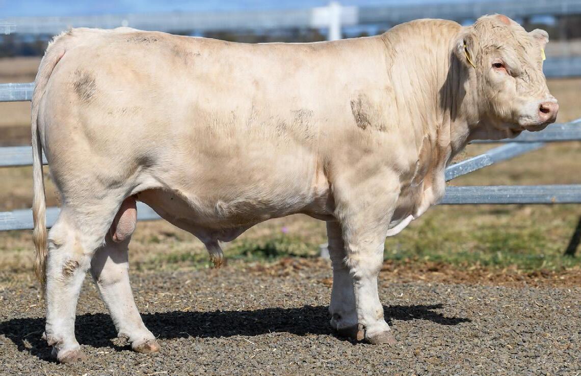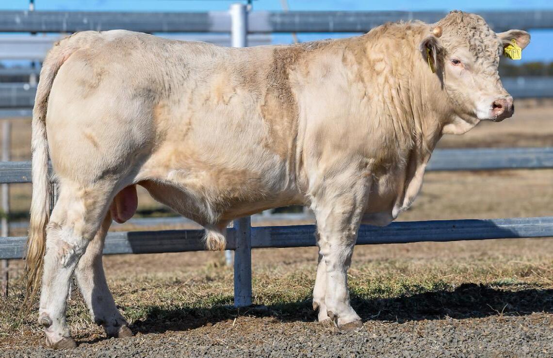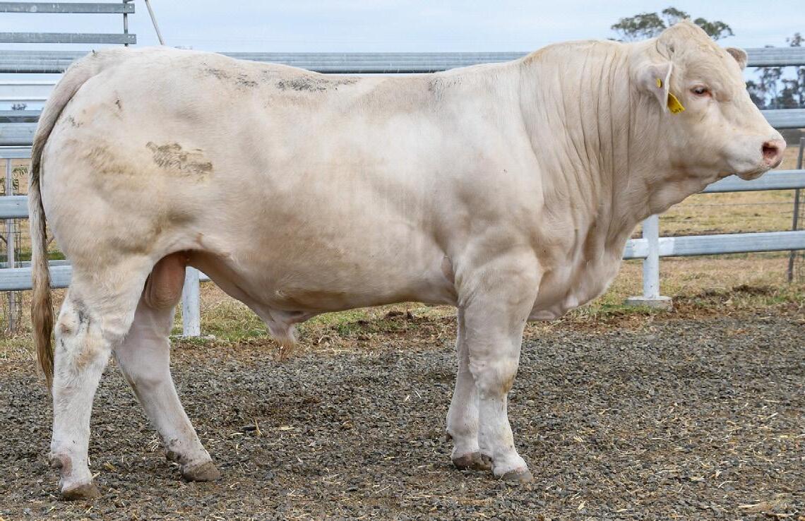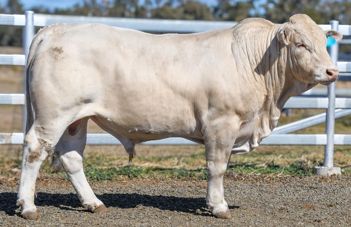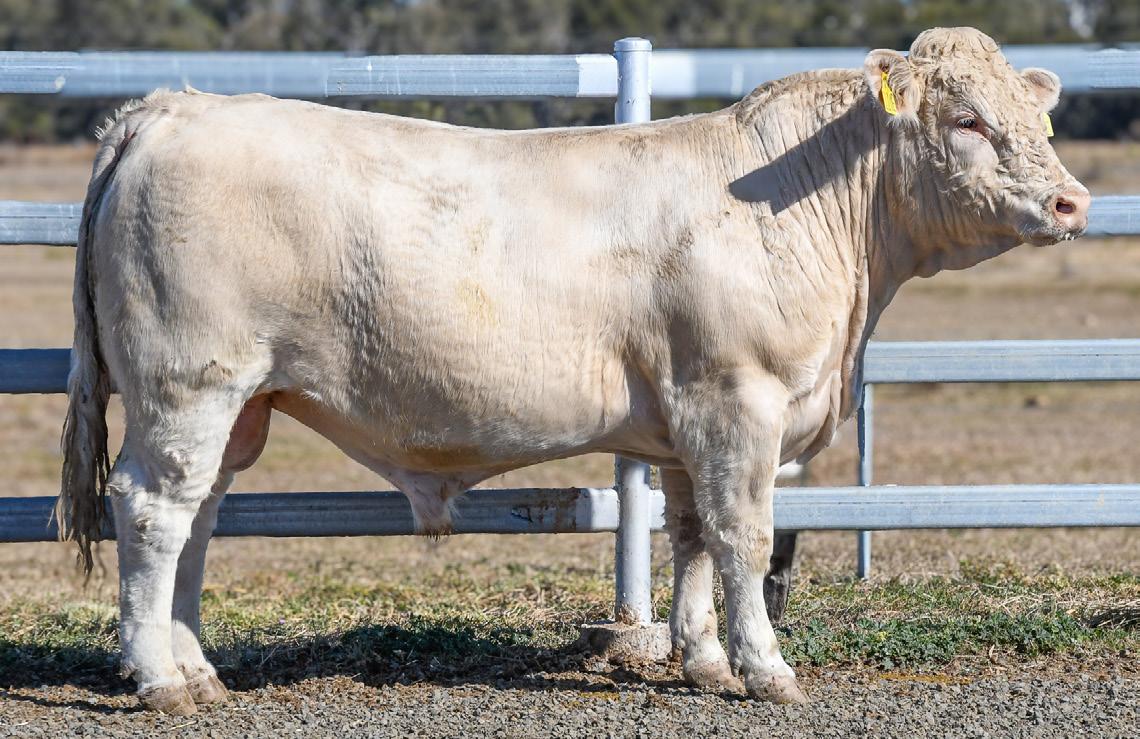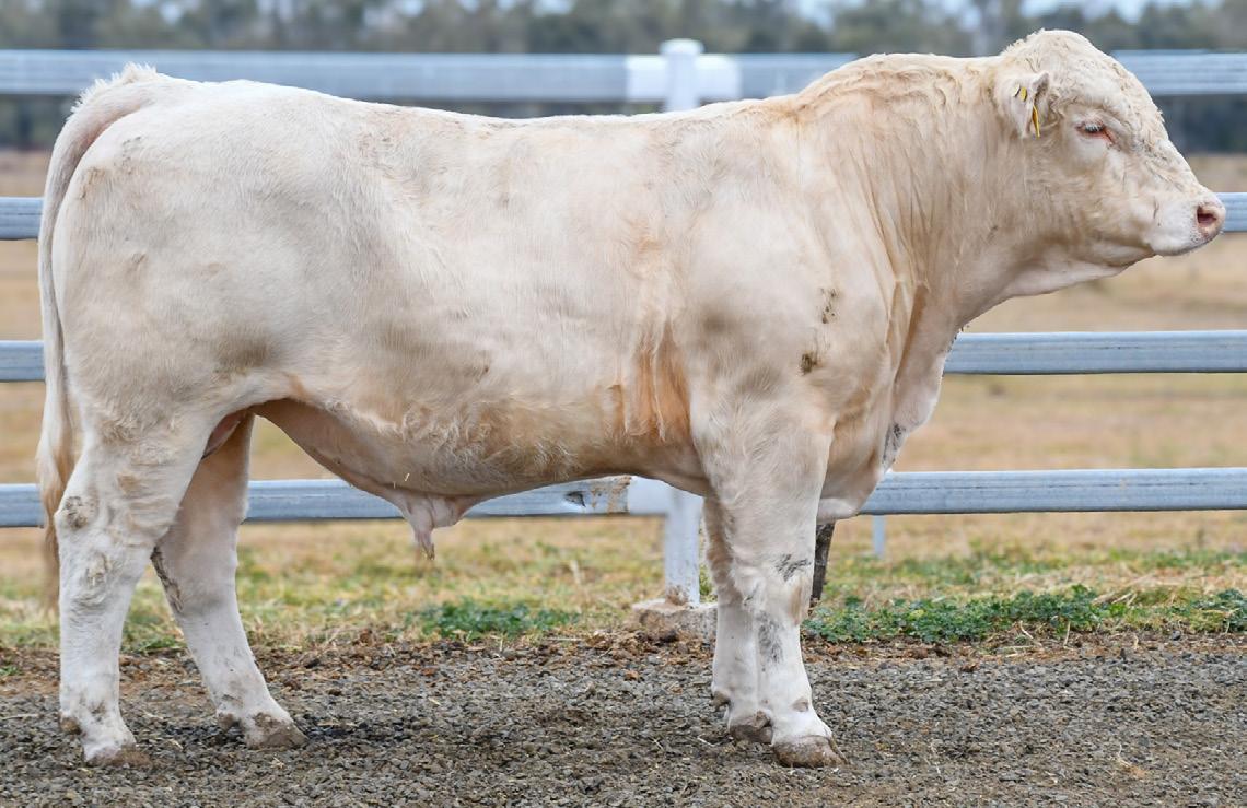 A well put together charbray bull that deserves a good look, 3/4 Charolais and 1/4 Brahman. A lovely sleek coat, tidy underneath and a nice muscle pattern. This bull also has a good temperament.
