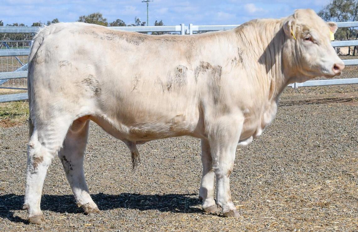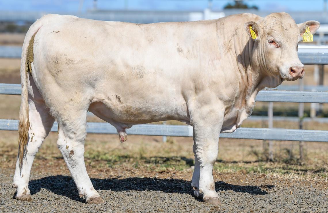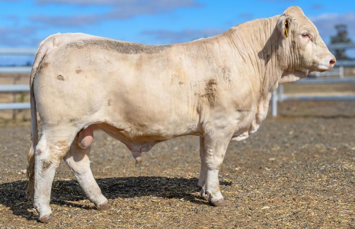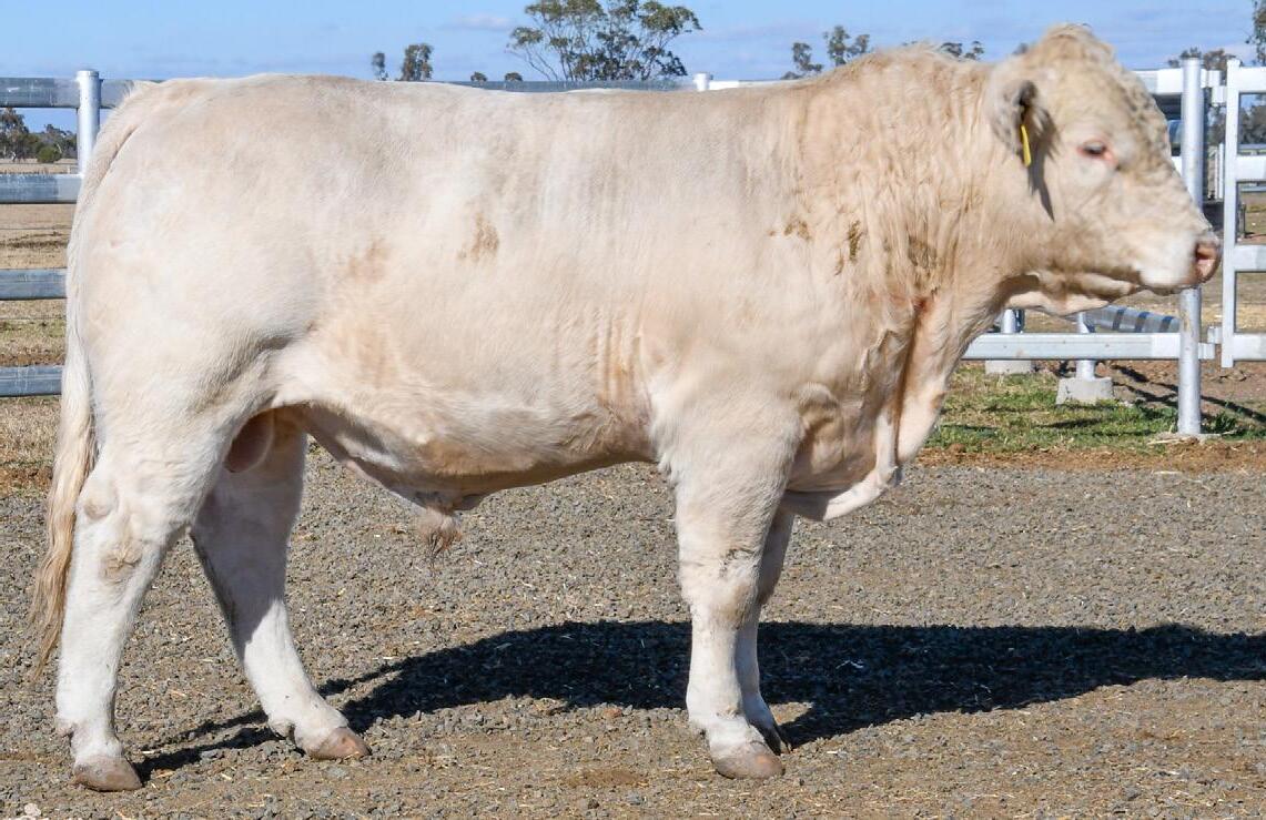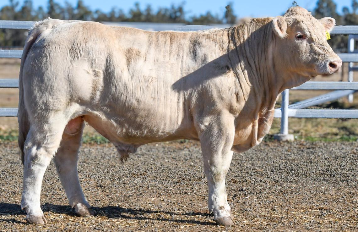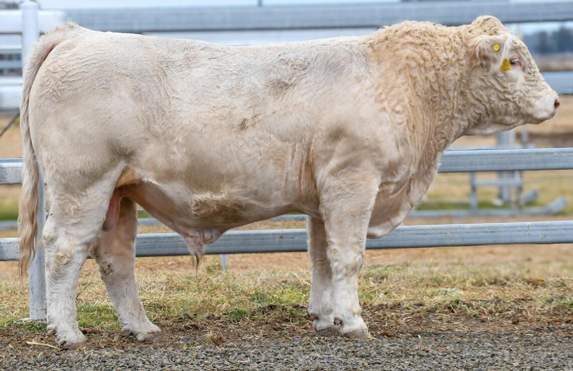 A well put together charbray bull that deserves a good look, 3/4 Charolais and 1/4 Brahman. A lovely sleek coat, tidy underneath and a nice muscle pattern. This bull also has a good temperament.