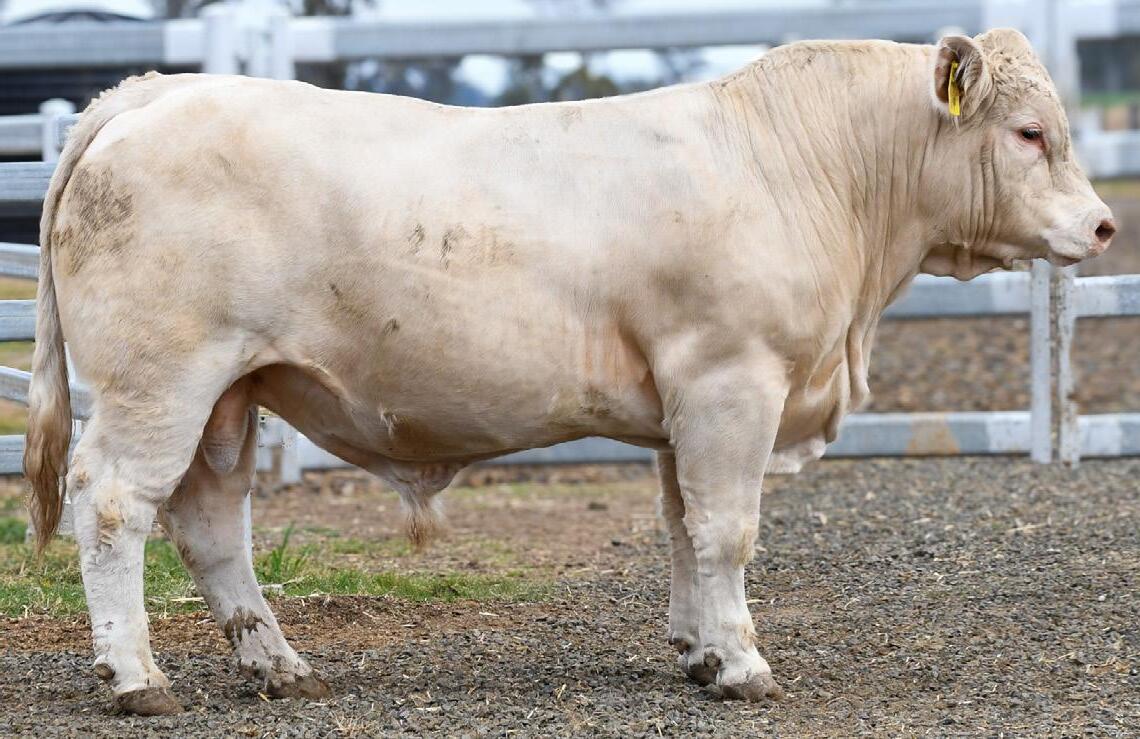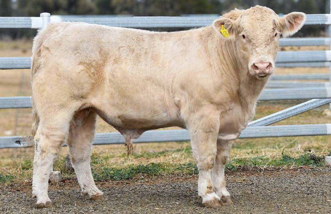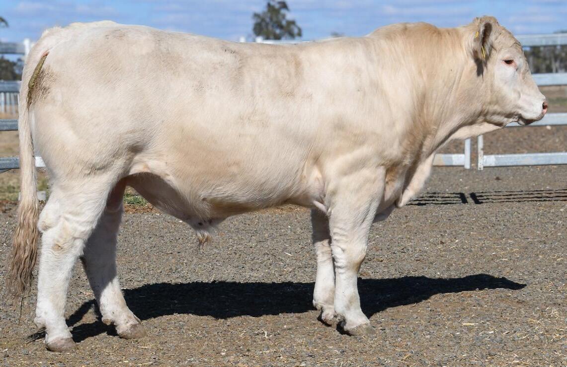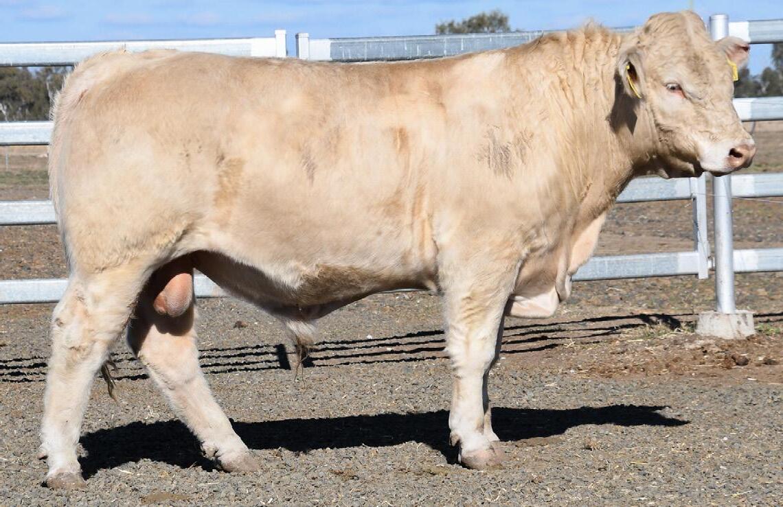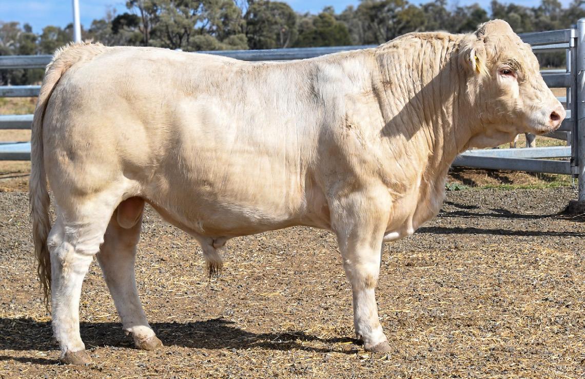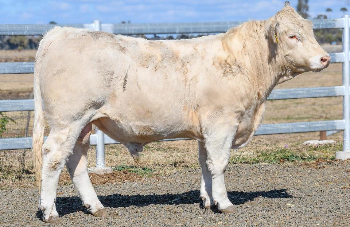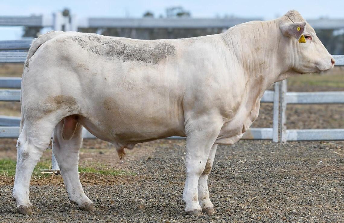 A well put together charbray bull that deserves a good look, 3/4 Charolais and 1/4 Brahman. A lovely sleek coat, tidy underneath and a nice muscle pattern. This bull also has a good temperament.
