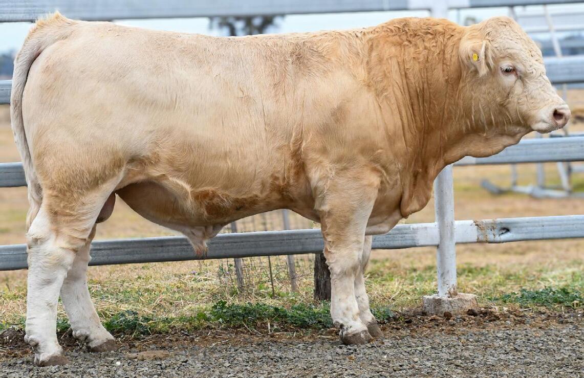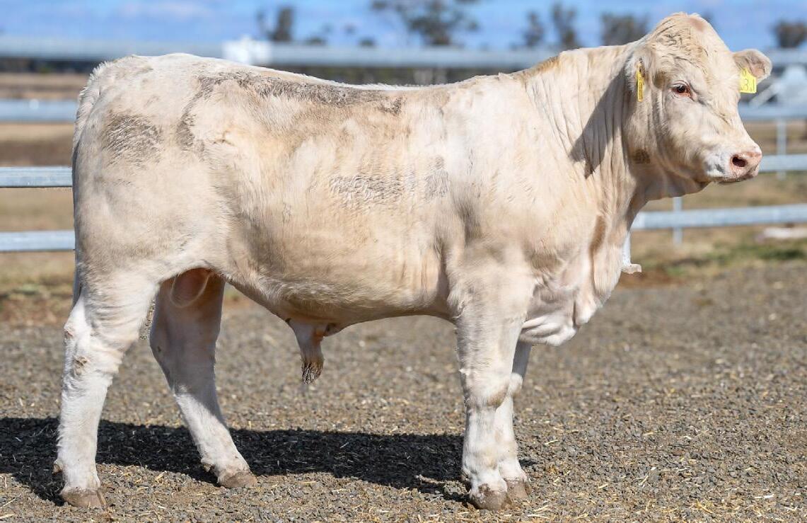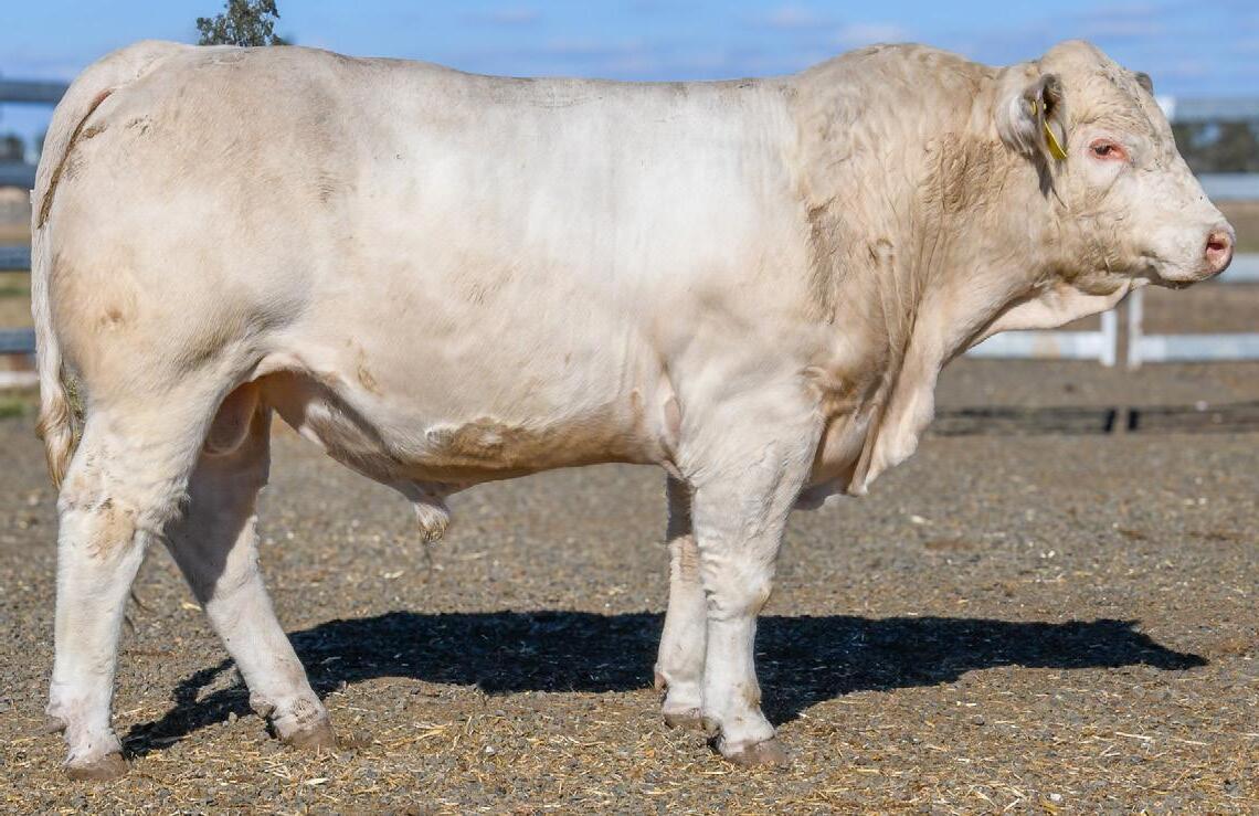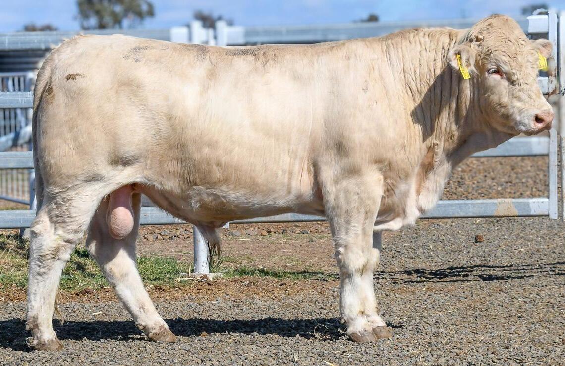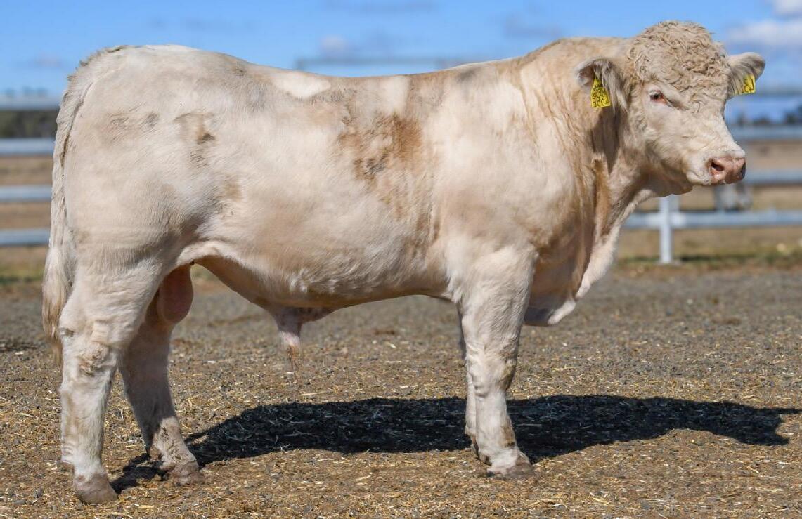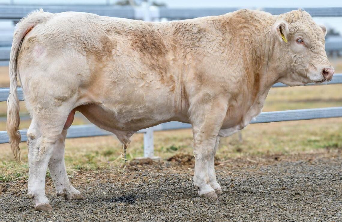 A well put together charbray bull that deserves a good look, 3/4 Charolais and 1/4 Brahman. A lovely sleek coat, tidy underneath and a nice muscle pattern. This bull also has a good temperament.