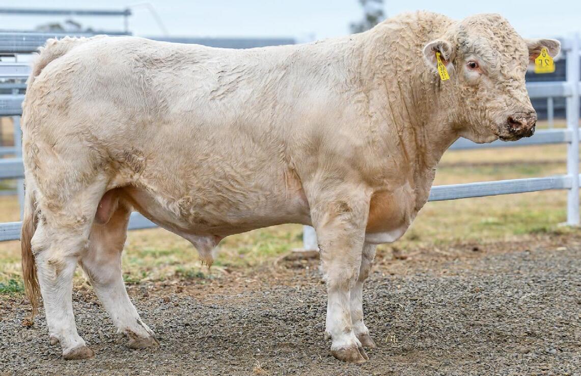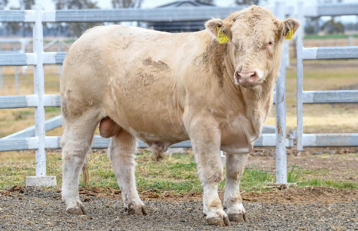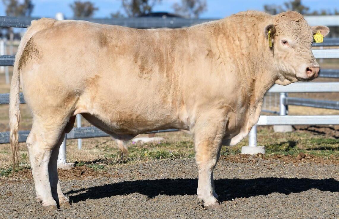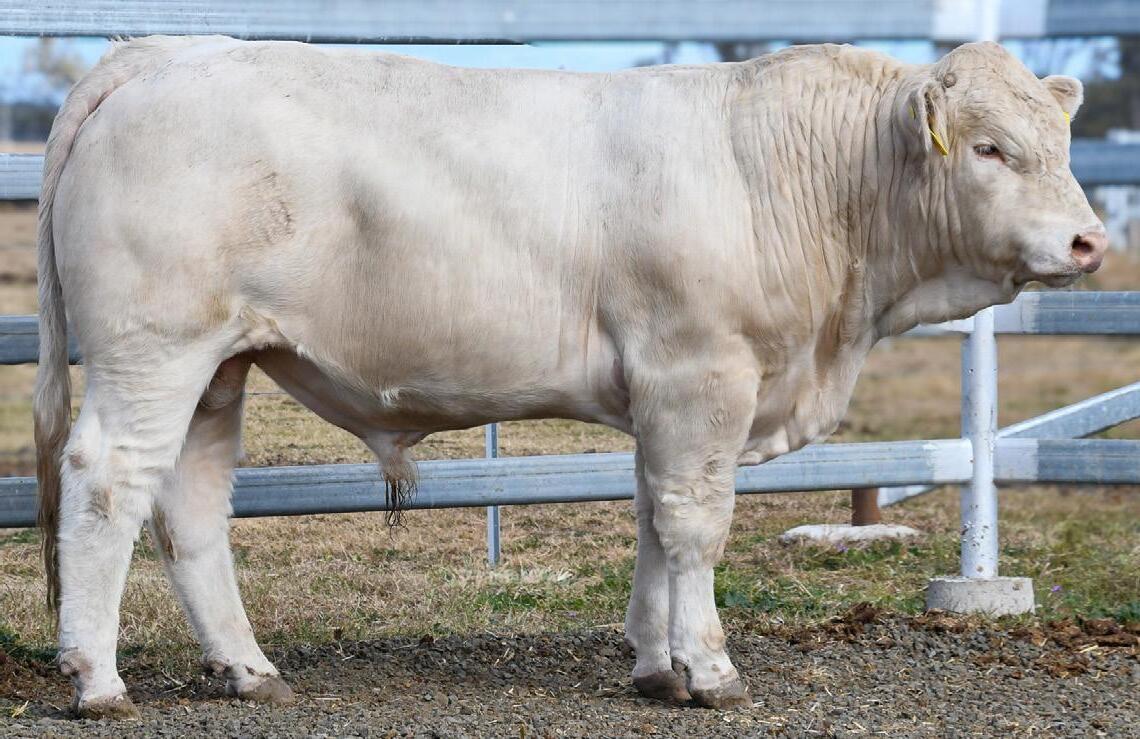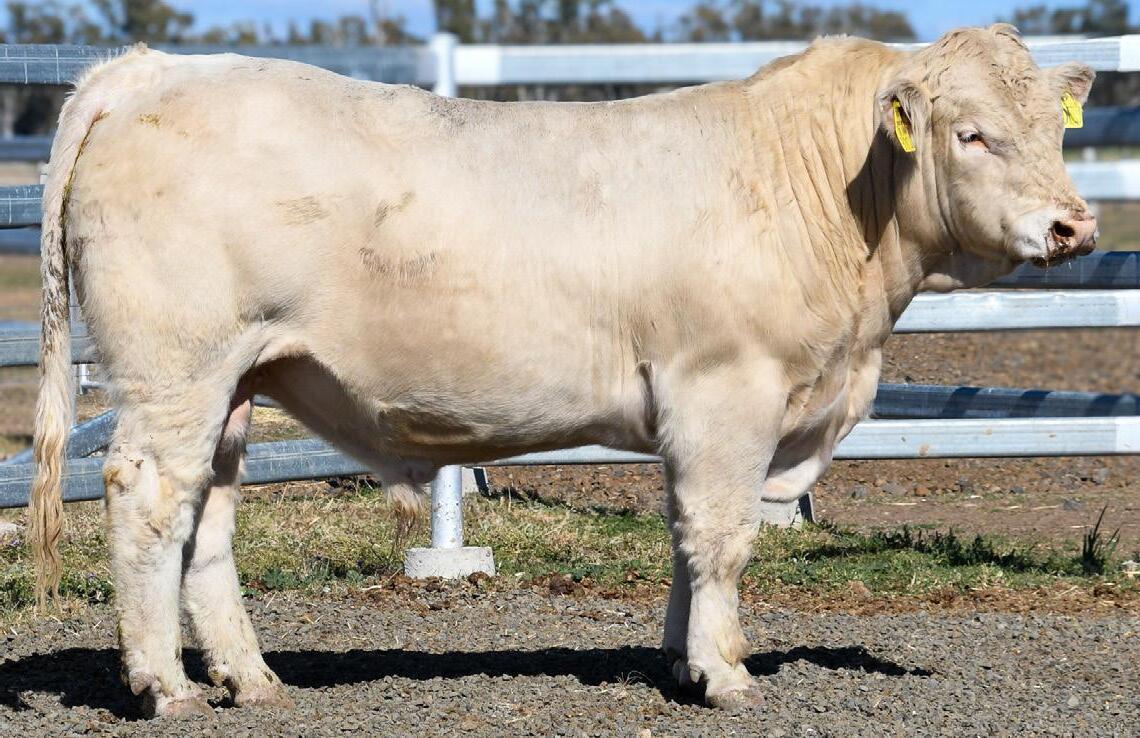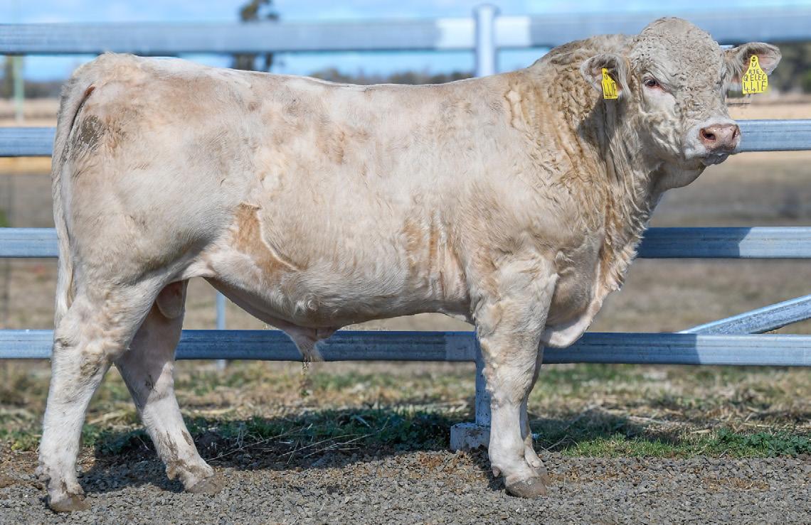 A well put together charbray bull that deserves a good look, 3/4 Charolais and 1/4 Brahman. A lovely sleek coat, tidy underneath and a nice muscle pattern. This bull also has a good temperament.