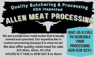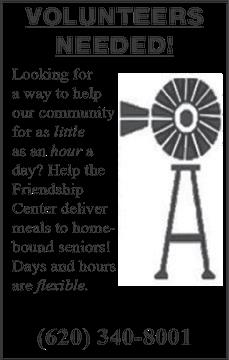 North Lyon County Senior meals are available in Allen for grab and go or home delivery. Meals are available Monday through Friday and must be ordered by 11 a.m. the previous day by calling 620-528-3414. If you are 60 or older, a $4 donation is appreciated, meal is $7 for those under 60. Call for more information.