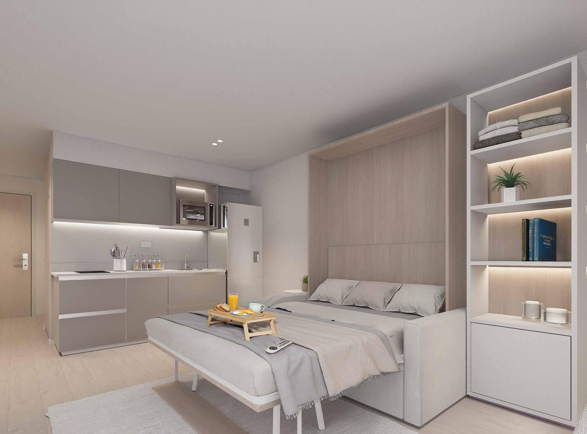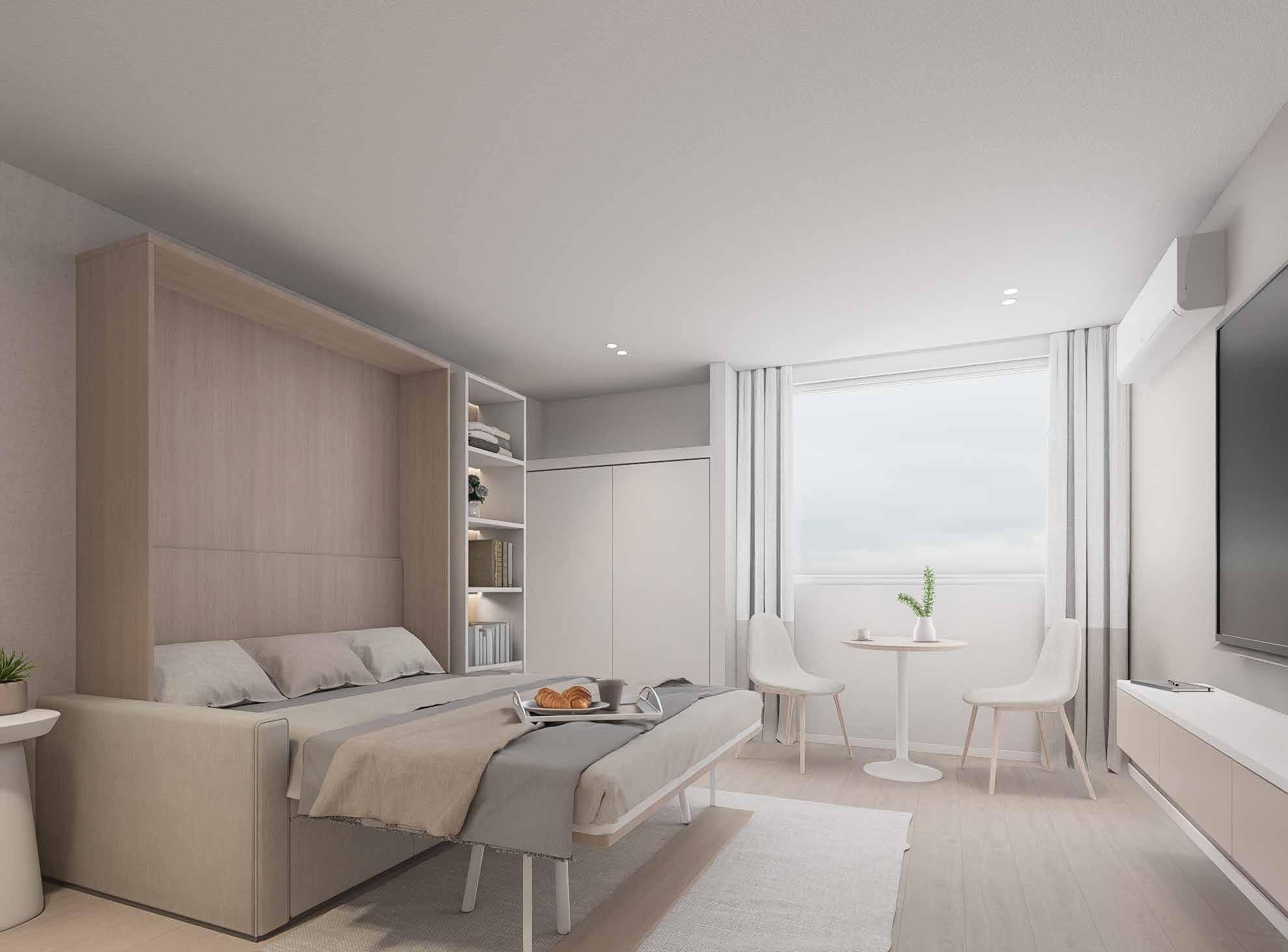 optimiza el espacio armarios, cama, closets y cocina, usando materiales de alta calidad para una estética elegante y atemporal.