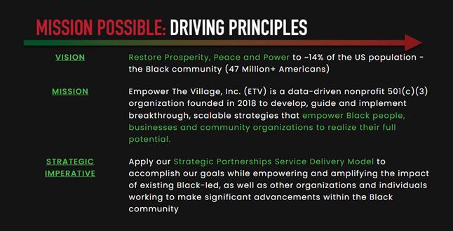 Our vision is clear: To ensure that all Black Americans and historically marginalized communitiesrealizetheirfullpotentialbypartneringwith“TheVillage”todeliverdata-driven solutions.Thisprogresswehavemadetowardsachievingourmissionwouldnothavebeen possiblewithoutyourunwaveringsupportandbeliefinourvision.