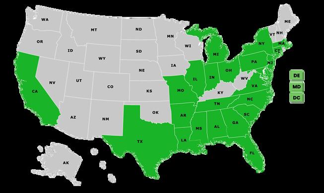 States Included: Arizona, Arkansas, Florida, Georgia, Kentucky, Louisiana, Maryland, Massachusetts, Michigan, Nevada, New Jersey, New York, North Carolina, Ohio, Pennsylvania, South Carolina, Texas, Virginia, Wisconsin