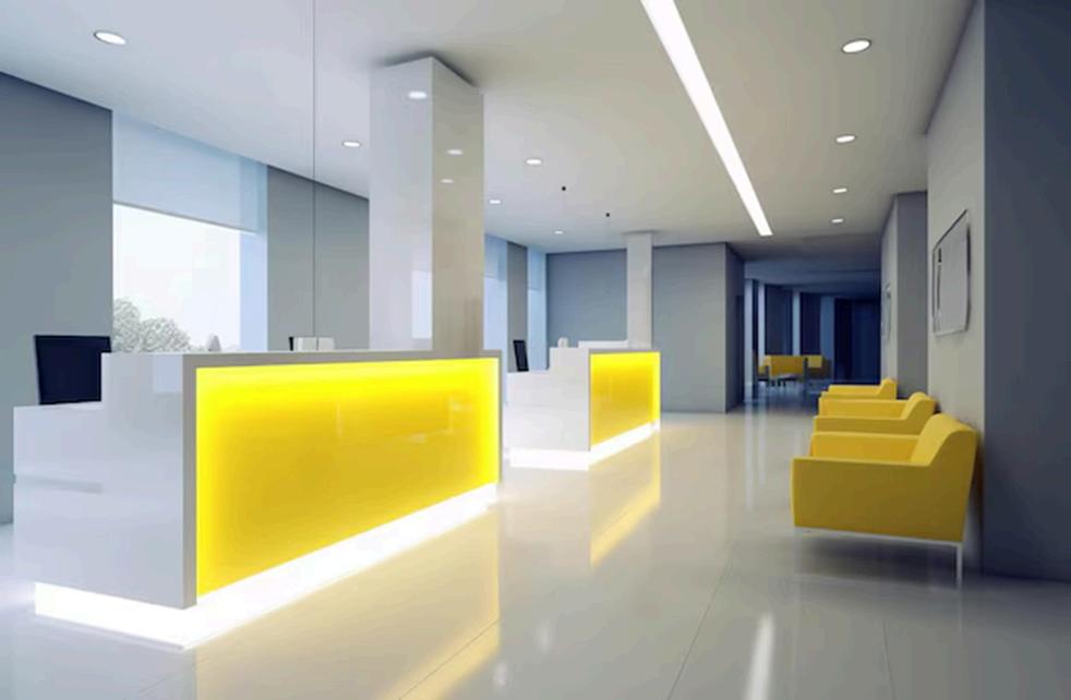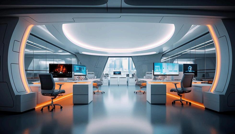 Diseño oficina moderna y futurista para un ambiente de trabajo cómodo y efectivo.