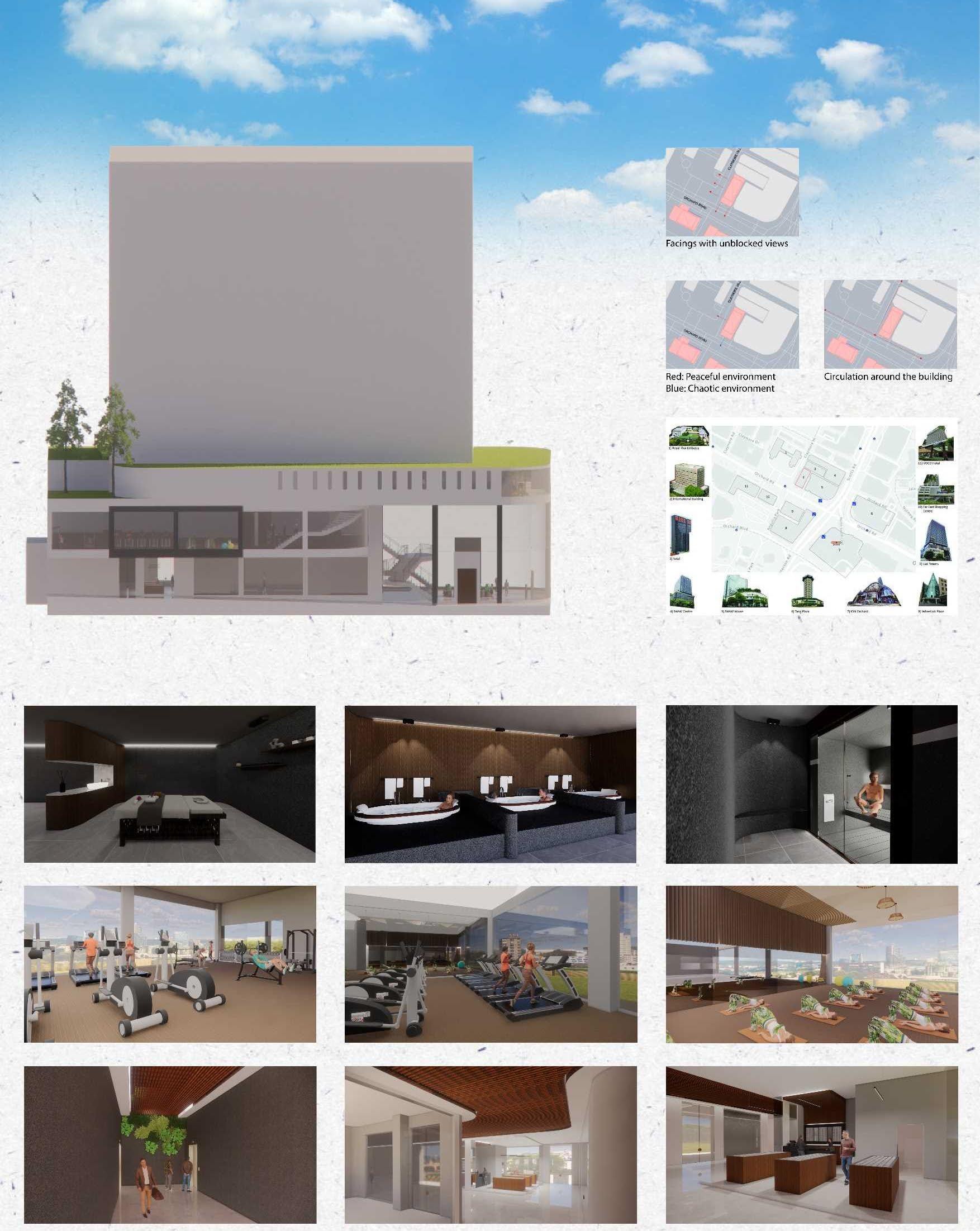 With inspiration from the filtering capabilities of the Giant Larvaceans, the project aims to filter sunlight and enable users to do various outdoor activities throughout the day. This project’s context takes place in the year 2080 where Singapore faces land shortage. Hence, the project is developed upwards and situates on top of an under-utilized multi-storey carpark in a residential area.