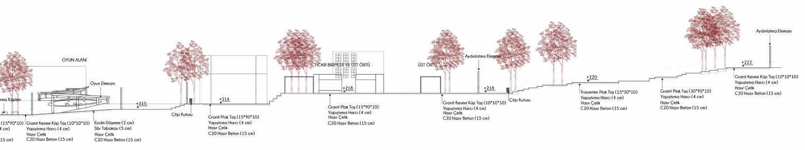 7- Small inner courtyards and squares with different levels and ramp solutions are foreseen in the focus area; In these spaces, different activities, commercial functions are proposed and supported with landscaping and urban furniture suitable for the texture.