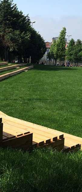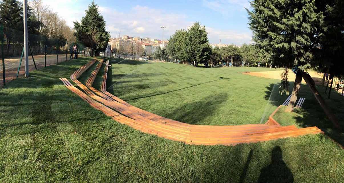 Composite panel work was carried out on a sloping area in Cengiz Topel park of Sultangazi district of Istanbul. Composite panel used as coating material was mounted on the impregnated wood carcass system, which was manufactured in accordance with the lines in the project. It is located as a landscape element where the hill slope meets a striking object.