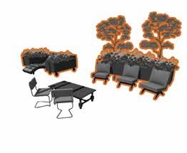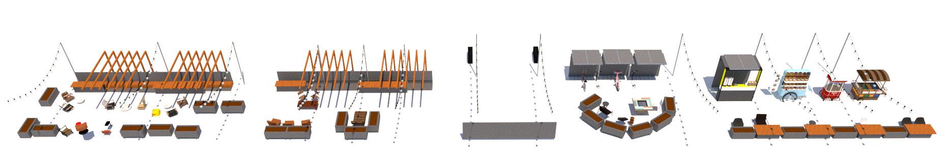 The use of movable and modular urban furniture encourages user participation in shaping the public spaces. Planters with plants also improve public space quality. Users can design their spaces considering privacy (new normal). Modular sun shade, provides shelter for shading and rain also a vertical plane for climbing plants.