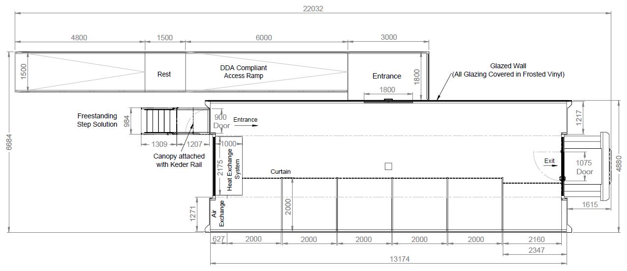 Total deployment footprint (inc. access ramp) : 21m x 8m