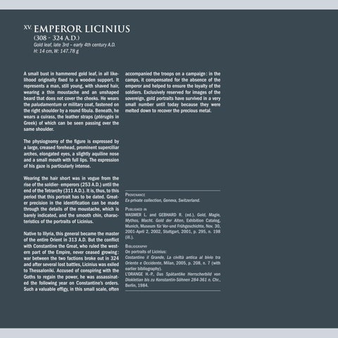 BIBLIOGRAPHY On portraits of Licinius: Costantino il Grande, La civiltà antica al bivio tra Oriente e Occidente, Milan, 2005, p. 208, n. 7 (with earlier bibliography). L’ORANGE H.-P., Das Spätantike Herrscherbild von Diokletian bis zu Konstantin-Söhnen 284-361 n. Chr., Berlin, 1984.