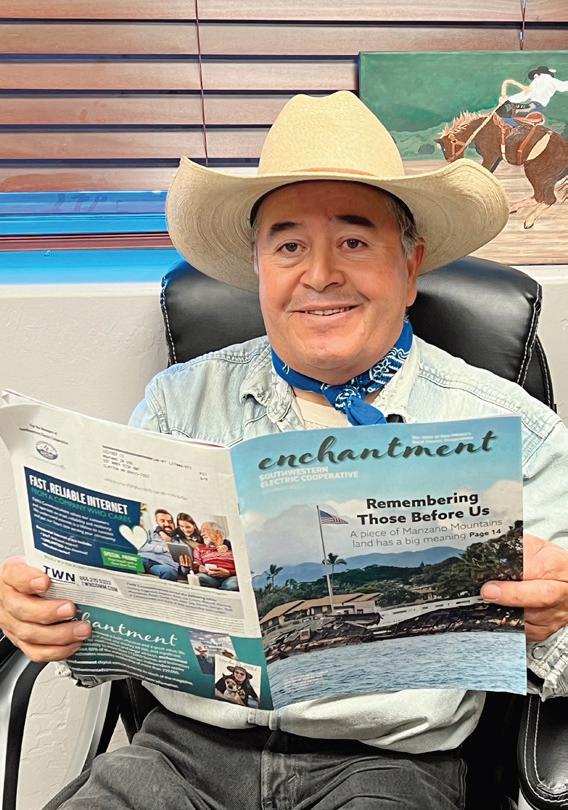 © New Mexico Rural Electric Cooperative Association Inc., in partnership with Pioneer Utility Resources. Reproduction prohibited without written permission of the publisher. How to contact enchantment: Phone 505-982-4671 Email enchantment@nmelectric.coop Facebook facebook.com/enchantmentnmreca Mail 614 Don Gaspar Ave. Santa Fe, NM 87505 Community Events events@nmelectric.coop Display Ads enchantmentads@nmelectric.coop Book Chat Inquiries enchantment@nmelectric.coop Take a photo of yourself