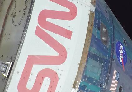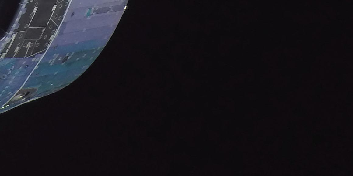 The Orion capsule from NASA’s Artemis 1 mission, with the moon and Earth in the background.