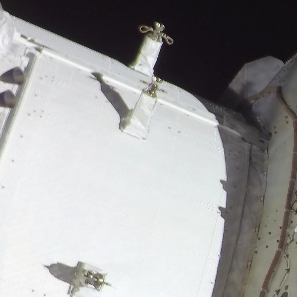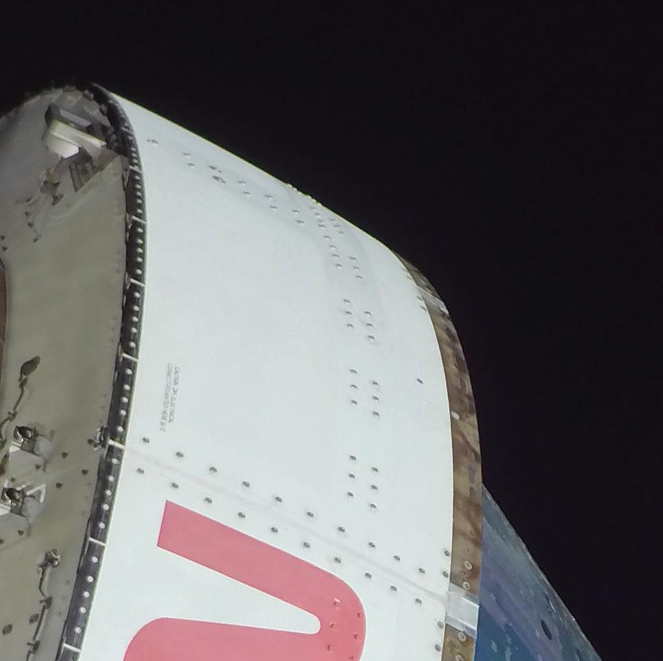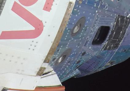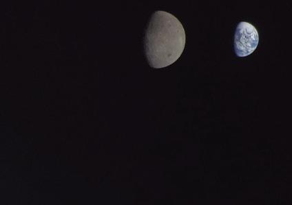 The Orion capsule from NASA’s Artemis 1 mission, with the moon and Earth in the background.
