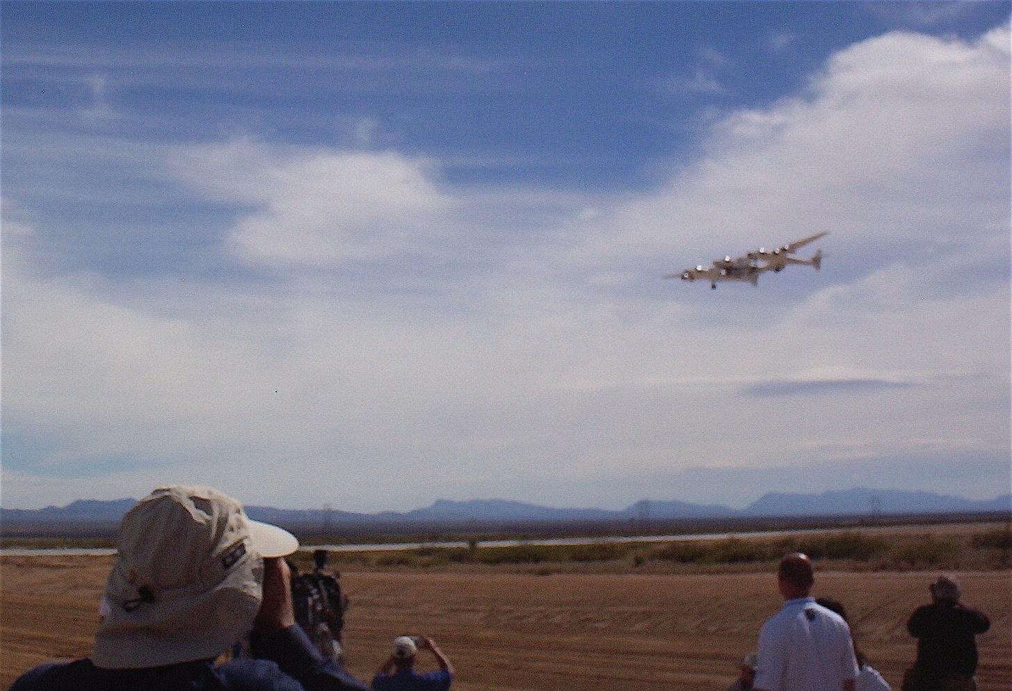 Virgin Galactic’s carrier vehicle, the White Knight Two, approaches the runway at Spaceport America during the runway’s dedication ceremony on October 22, 2010. Virgin Galactic successfully completed its first commercial space flight in June.