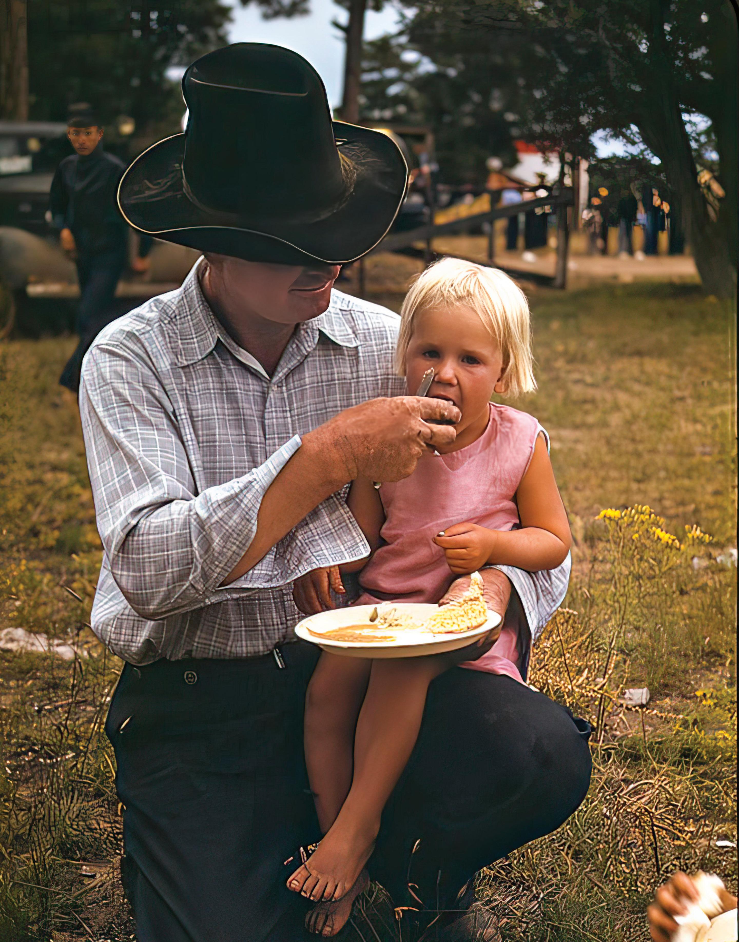 A homesteader feeds his daughter at the Pie Town Fair free barbecue in October 1940.