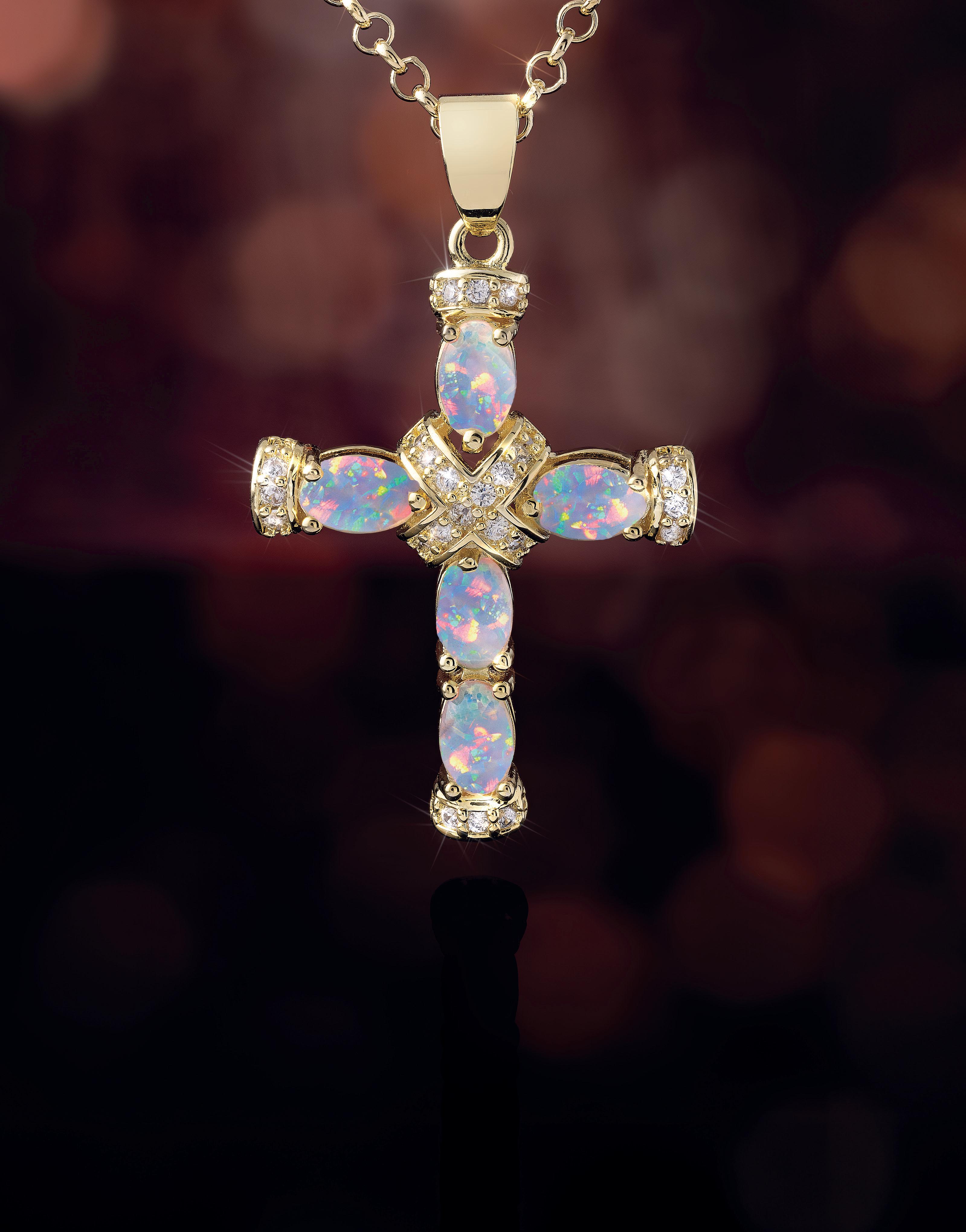 Using this story as inspiration, Stauer brings you the Opal Spirit Cross Pendant. With over 2 total carats of Kyocera lab-created opals set in .925 sterling silver encased in yellow gold, this pendant is a radiant celebration of beauty and craftsmanship. Each opal captivates with a kaleidoscopic dance of fiery oranges blending into oceanic blues, streaked with flashes of vibrant green that seem to come alive with every movement. The shimmering opals are skillfully arranged to create an enchanting, otherworldly glow, embodying the spirit of hope and harmony. This breathtaking combination of color and craftsmanship is available as a limited availability of only