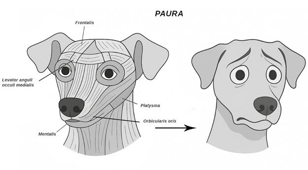 Le orecchie si abbassano e si appiattiscono contro la testa, gli occhi si spalancano fino a lasciare intravedere la sclera, la fronte si contrae in rughe visibili, le labbra si tendono o si retraggono scoprendo i denti, lo sguardo si distoglie o si fa sfuggente.