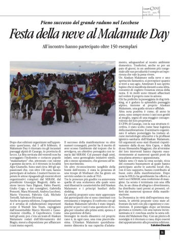 Il successo della manifestazione va oltre numeri conseguiti, perché ha il merito di aver scosso l’ambiente dal torpore che lo avvolgeva, un obiettivo perseguito con te nacia dal SERAM. Col passare degli anni, infatti, sono germogliate iniziative simili, più o meno spontanee, che giovano all’in tero movimento. Un altro riconoscimento tangibile della bontà dell’evento, è stata la presenza di una troupe di Mediaset che ha girato un servizio andato in onda al TG5. Tra le presenze più gradite va annoverata quella di una scolaresca alla quale sono stati illustrati le caratteristiche dell’Alaskan Malamute e i principi basilari dello sleddog. Le attività proposte sono state apprezzate dai partecipanti che si sono cimentati con entusiasmo e impegno. Il confronto con gli Alaskan Malamute talvolta è stato impari, poiché se per i cani è una questione di vo glia per i musher alle prime armi, spesso, è una questione di fiato. Interagire in modo dinamico col proprio cane è, in ogni caso, una cosa piacevolis sima. L’Alaskan Malamute quotidiana mente dimostra la sua capacita d’adatta