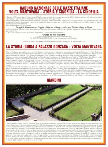 RADUNO NAZIONALE DELLE RAZZE ITALIANE VOLTA MANTOVANA – STORIA E CINOFILIA - LA CINOFILIA Il 6 giugno 2010, presso i giardini rinascimentali di Villa Gonzaga, sede dell’amministrazione comunale di Volta Mantovana si terrà la 6° edizione del raduno nazionale delle razze italiane. La manifestazione è pertanto riservata alle seguenti razze: pastore bergamasco, pastore maremmano abruzzese, cane corso, mastino napoletano, cirneco dell’Etna, volpino italiano, segugio italiano a pelo forte, segugio italiano a pelo raso, segugio maremmano, segugio dell’Appennino (pelo raso e pelo forte), bracco italiano, spinone italiano, lagotto romagnolo, maltese e piccolo levriero italiano. Sono previsti i seguenti raggruppamenti: