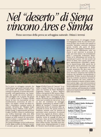 fetti l’abbondanza di selvaggina minuta accompagnata anche da una buona presenza di lepri, non ricorda certo quanto si potrebbe intendere sentendo nominare questa località alle porte di Siena. Particolare e sintomatica l’assenza di predatori e nocivi: difficilmente nelle ore diurne si può osservare la presenza di volpi, qui come altrove, ma normalmente gazze e cornacchie svolazzano liberamente ed in abbondanza nei terreni frequentati per le prove. Ciò non accade nei divieti di Siena, dove queste specie vengono sapientemente controllate a garantire la sopravvivenza delle specie per le quali queste oasi di protezione sono nate. Per noi tutto ciò rappresenta un fondamentale strumento che deve essere conservato e rispettato, nell’ovvia comprensione del lavoro adoperato dai Comitati di Gestione che meritano riconoscimento e gratitudine. Di fatto, la prova Nazionale di Siena ha costituito un prezioso strumento, quella situazione che trova conferma rispetto al passato in merito ai fattori analizzati in queste righe, e che tutti vorremmo si potesse mantenere nella convivenza con la tutela ambientale e faunistica, per l’opportunità continua nell’ottenimento di quelle indicazioni fondamentali nell’allevamento delle razze da ferma. M.R.