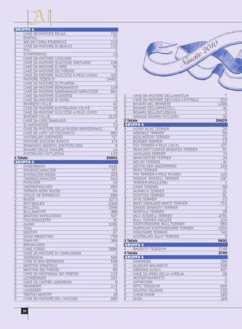 GRUPPO 1 1 CANE DA PASTORE BELGA 752 1 BOBTAIL 71 1 WELSH CORGI PEMBROKE 103 1 CANE DA PASTORE DI BEAUCE 102 1 PULI 1 1 SCHIPPERKEE 13 1 CANE DA PASTORE CATALANO 7 1 CANE DA PASTORE SCOZZESE SHETLAND 106 1 CANE DA PASTORE DI BRIE 55 1 CANE DA PASTORE DEI PIRENEI 5 1 CANE DA PASTORE SCOZZESE A PELO LUNGO 420 1 PASTORE TEDESCO 14451 1 CANE DA PASTORE DI PICARDIA 4 1 CANE DA PASTORE BERGAMASCO 109 1 CANE DA PASTORE MAREMMANO ABRUZZESE 684 1 CANE DA PASTORE OLANDESE 2 1 CANE DA PASTORE DI TATRA 2 1 BEARDED COLLIE 40 1 CANE DA PASTORE AUSTRALIANO KELPIE 16 1 CANE DA PASTORE SCOZZESE A PELO CORTO 2 1 BORDER COLLIE 2129 1 CANE DA LUPO SAARLOOS 4 1 SCHAPENDOES 23 1 CANE DA PASTORE DELLA RUSSIA MERIDIONALE 6 1 CANE DA LUPO CECOSLOVACCO 660 1 AUSTRALIAN SHEPHERD 717 1 PASTORE SVIZZERO BIANCO 174 1 ROMANIAN MIORITIC SHEPERD DOG 6 1 BOVARO DELLE FIANDRE 14 1 AUSTRALIAN CATTLEDOG 123 1 Totale 20801 GRUPPO 2 2 DOBERMANN 1431 2 RIESENSCHNAUZER 271 2 SCHNAUZER MEDIO 223 2 ZWERGSCHNAUZER 543 2 PINSCHER 18 2 ZWERGPINSCHER 689 2 TERRIER NERO RUSSO 54 2 DOGUE DE BORDEAUX 698 2 BOXER 3273 2 ROTTWEILER 2346 2 BULLDOG 1556 2 BULLMASTIFF 386 2 MASTINO NAPOLETANO 547 2 FILA BRASILEIRO 31 2 ALANO 1091 2 TOSA 10 2 MASTIFF 87 2 DOGO ARGENTINO 799 2 SHAR PEI 389 2 BROHOLMER 4 2 CANE CORSO 2686 2 CANE DA PASTORE DI CIARPLANINA 4 2 TERRANOVA 588 2 CANE DI SAN BERNARDO 546 2 MASTINO SPAGNOLO 23 2 MASTINO DEI PIRENEI 69 2 CANE DA MONTAGNA DEI PIRENEI 124 2 LEONBERGER 157 2 CANE DE CASTRO LABOREIRO 6 2 HOVAWART 114 2 LANDSEER 8 2 TIBETAN MASTIFF 16 2 CANE DA PASTORE DEL CAUCASO 262