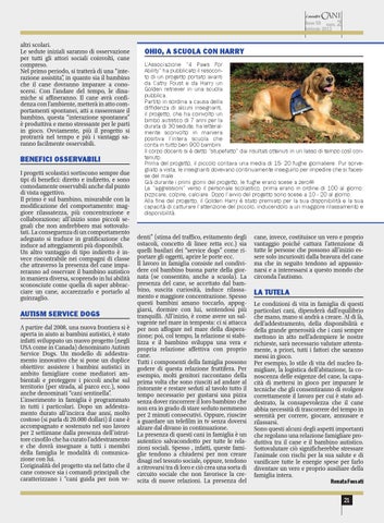 OHIO, A SCUOLA CON HARRY L’Associazione “4 Paws For Ability” ha pubblicato il resoconto di un progetto portato avanti da Cathy Foust e da Harry un Golden retriever in una scuola pubblica. Partito in sordina a causa della diffidenza di alcuni insegnanti, il progetto, che ha coinvolto un bimbo autistico di 7 anni per la durata di 30 sedute, ha letteralmente sconvolto in maniera positiva l’intera scuola che conta in tutto ben 900 bambini. Il corpo docenti si è detto “stupefatto” dai risultati ottenuti in un lasso di tempo così contenuto. Prima del progetto, il piccolo contava una media di 15- 20 fughe giornaliere. Pur sorvegliato a vista, le insegnanti dovevano continuamente inseguirlo per impedire che si facesse del male. Già durante i primi giorni del progetto, le fughe erano scese a zero!!! Le “aggressioni” verso il personale scolastico, prima erano in ordine di 100 al giorno: pizzicare, colpire, calciare. Dopo l’avvio del progetto sono scese a 10 - 20 al giorno. Alla fine del progetto, il Golden Harry è stato premiato per la sua disponibilità e la sua capacità di catturare l’attenzione del piccolo, inducendolo a un maggiore rilassamento e disponibilità.