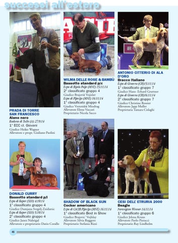 ANTONIO CITTERIO DI ALA D’ORO WILMA DELLE ROSE & BAMBÙ Bracco Italiano Bassotto standard p/c Expo di Ginevra (CH)15/11/14 Expo di Bijelo Polje (MNE) 15/11/14 1° classificato gruppo 7 2° classificato gruppo 4 Giudice Hans- Erhard Gruttner Giudice Brajović Vojislav Expo di Ginevra (CH)16/11/14 Expo di Pljevlja (MNE) 16/11/14 2° classificato gruppo 7 1° classificato gruppo 4 Giudice Christine Rossier
