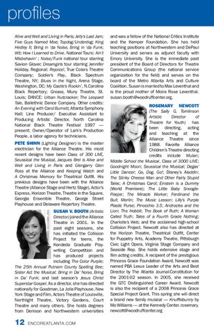 profiles Alive and Well and Living in Paris; Jelly’s Last Jam; Five Guys Named Moe; Topdog/Underdog; King Hedley II; Bring in ‘da Noise, Bring in ‘da Funk; Wit; How I Learned to Drive. National Tours: Ain’t Misbehavin’ ; Noise/Funk national tour starring Savion Glover; Dreamgirls tour starring Jennifer Holiday. Regional: Rejoice!, True Colors Theatre Company; Soldier’s Play, Black Spectrum Theatre, NY; Blues in the Night, Arena Stage, Washington, DC; My Castle’s Rockin’, N.Carolina Black Repertory; Grease, Muny Theatre, St. Louis; DANCE: Urban Nutcracker; The Leopard Tale, Ballethnic Dance Company. Other credits: An Evening with Carol Burnett, Atlanta Symphony Hall; Line Producer/ Executive Assistant to Producing Artistic Director, North Carolina National Black Theatre Festival 1997 — present; Owner/Operator of Lark’s Production People, a labor agency for technicians. PETE SHINN (Lighting Designer) is the master electrician for the Alliance Theatre. His most recent designs have been Class of 300 LIVE, Seussical the Musical, Jacques Brel is Alive and Well and Living in Paris and Glengarry Glen Ross at the Alliance and Keeping Watch and A Christmas Memory for Theatrical Outfit. His previous designs have been with the Alliance Theatre (Alliance Stage and Hertz Stage), Actor’s Express, Horizon Theatre, Theatre in the Square, Georgia Ensemble Theatre, George Street Playhouse and Delaware Repertory Theatre. SUSAN V. BOOTH (Artistic Director) joined the Alliance Theatre in 2001. In the past eight seasons, she has initiated the Collision Project for teens, the Kendeda Graduate Playwriting Competition and has produced projects including The Color Purple; The 25th Annual Putnam County Spelling Bee; Sister Act the Musical; Bring in Da’ Noise, Bring in Da’ Funk; and last season’s Jesus Christ Superstar Gospel. As a director, she has directed nationally for Goodman, La Jolla Playhouse, New York Stage and Film, Actors Theatre of Louisville, Northlight Theatre, Victory Gardens, Court Theatre and many others. She holds degrees from Denison and Northwestern universities