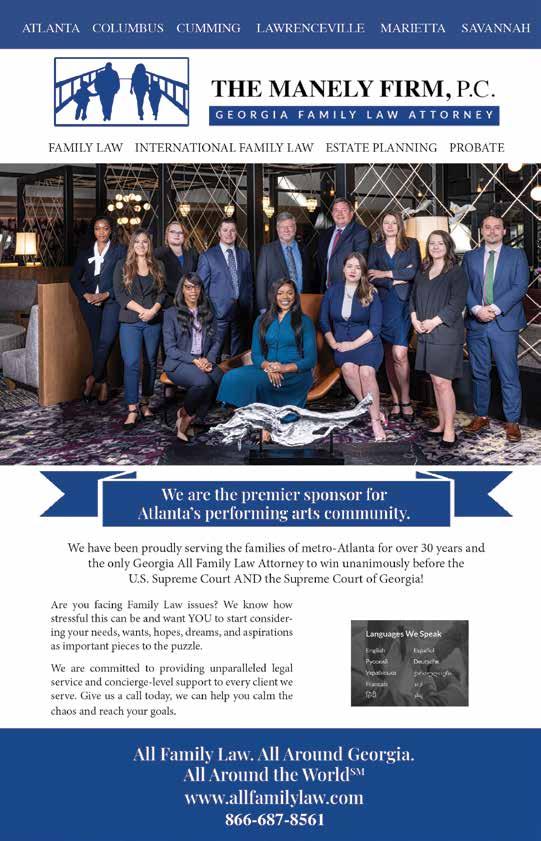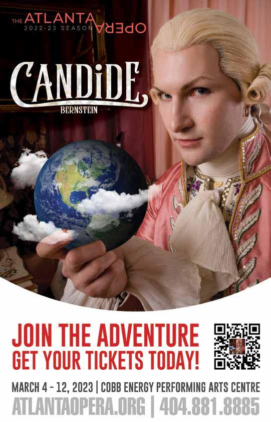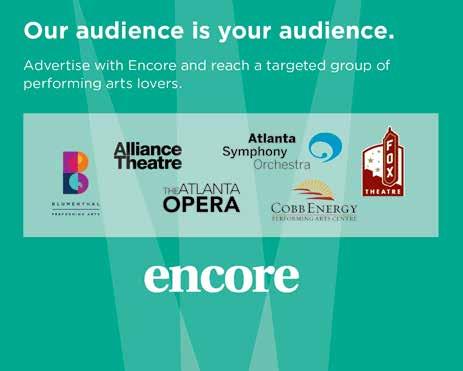 ENCOREATLANTA.COM PUBLISHER Brantley Manderson brantley@encoreatlanta.com SENIOR ACCOUNT DIRECTOR Donna Choate donna@encoreatlanta.com EDITOR IN CHIEF Robert Viagas robert@encoreatlanta.com GRAPHIC DESIGNER Tamara Hooks tamara@encoreatlanta.com DIGITAL MEDIA DIRECTOR Jennifer Nelson jennifer@encoreatlanta.com ENCORE ATLANTA is published monthly by B2 MEDIA, LLC. P.O. Box 1377 | Columbus, Georgia 31902 Phone 678-837-4004 Copyright © 2023 Encore Atlanta. All rights reserved. Reproduction in whole or in part is strictly prohibited. Encore Atlanta is a registered publication of B2 Media, LLC. The publisher shall not be liable for failure to publish an ad, for typographical errors, or errors in publication. Publisher reserves the right to refuse any advertising for any reason and to alter advertising copy or graphics deemed unacceptable for publication. encore Printed exclusively by Communicorp Our audience is your audience. Advertise with Encore and reach a targeted group of performing arts lovers. As one of the region’s largest Marketing Solutions Providers, Communicorp handles everything from print to digital to emerging technologies like clickable print or eCommerce storefronts. We guide clients through the maze of new marketing technologies and methodologies with a unique approach that always looks beyond yesterday’s solutions. Based in Columbus, GA, Communicorp is a wholly-owned subsidiary of Aflac. To learn more about our award-winning solutions, visit Communicorp.com. CONTACT Donna Choate 678-778-1573 donna@encoreatlanta.com