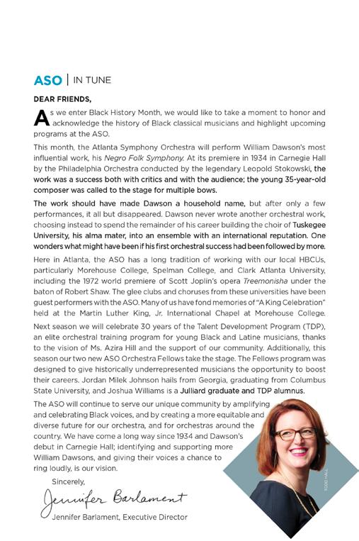 aso.org | @AtlantaSymphony | facebook.com/AtlantaSymphony FEBRUARY 2023 INTRODUCTIONS In Tune 4 Music Director 7 ASO Leadership ................... 8 ASO Musicians ................... 10 NOTES ON THE PROGRAM Written by Noel Morris FEBRUARY 2, 3 20 FEBRUARY 9, 11 .................. 28 FEBRUARY 23, 24 ................ 36 DEPARTMENTS ASO Support ..................... 44 Henry Sopkin Circle 48 ASO Staff 49 Woodruff Circle 51 Benefactor Circle ................. 52 Page 14 ASO Talent Development program celebrates 30 years. encoreatlanta.com | 1