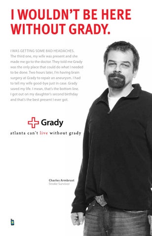 I WOULDN’T BE HERE WITHOUT GRADY. I WAS GETTING SOME BAD HEADACHES. The third one, my wife was present and she made me go to the doctor. They told me Grady was the only place that could do what I needed to be done. Two hours later, I’m having brain surgery at Grady to repair an aneurysm. I had to tell my wife good-bye just in case. Grady saved my life. I mean, that’s the bottom line. I got out on my daughter’s second birthday and that’s the best present I ever got.